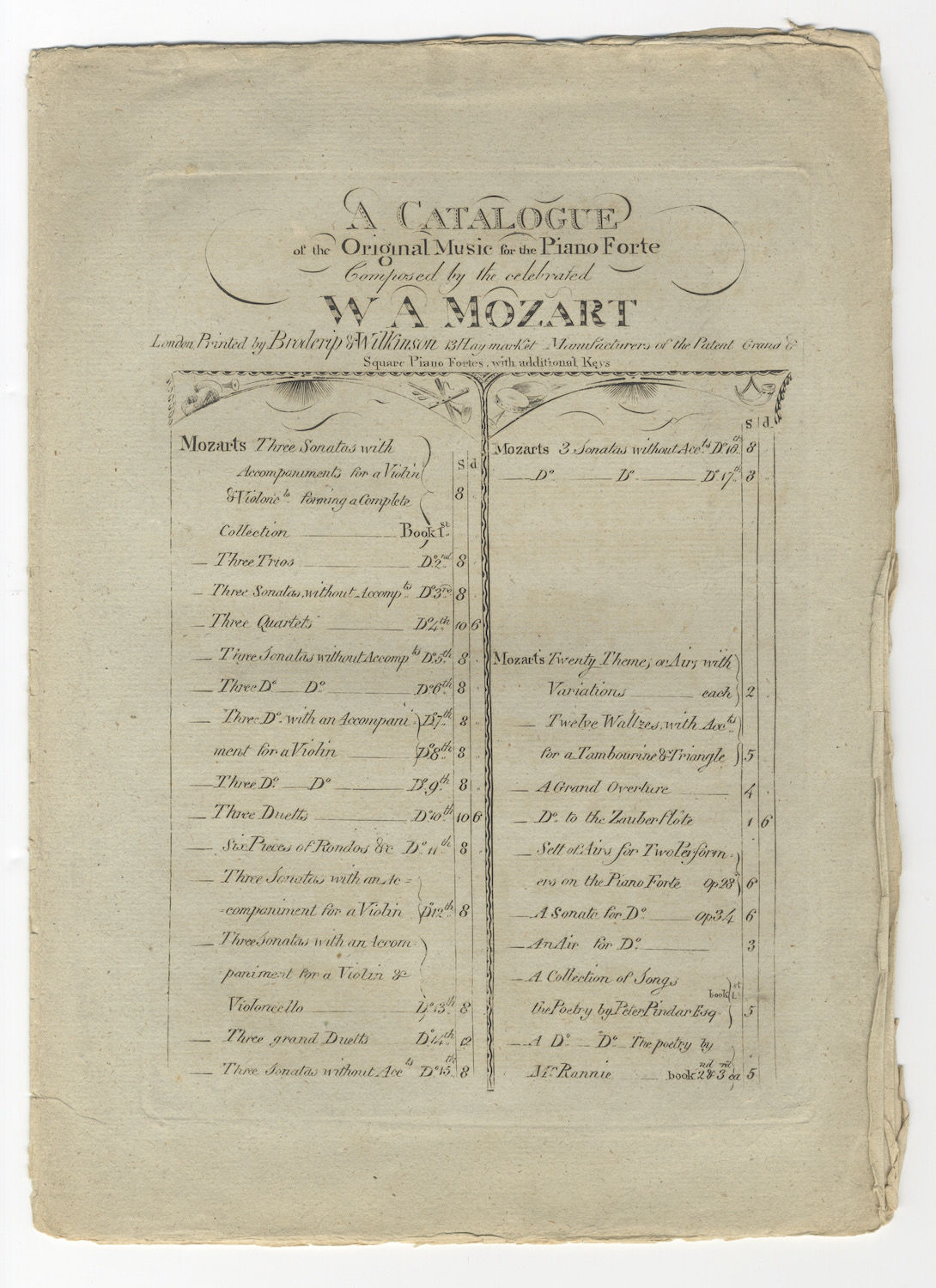 London: Broderip & Wilkinson, 13 Haymarket Manufacturers of the Patent Grand & Square Piano Fortes, with additional Keys, 1800. [1] A Catalogue of the Original Music for the Piano Forte Composed by the celebrated W A Mozart, 2-10 pp. Engraved. Watermark "1800." Köchel 6, Anh. C26.05 (Anh. 288), p. 896 (other editions).