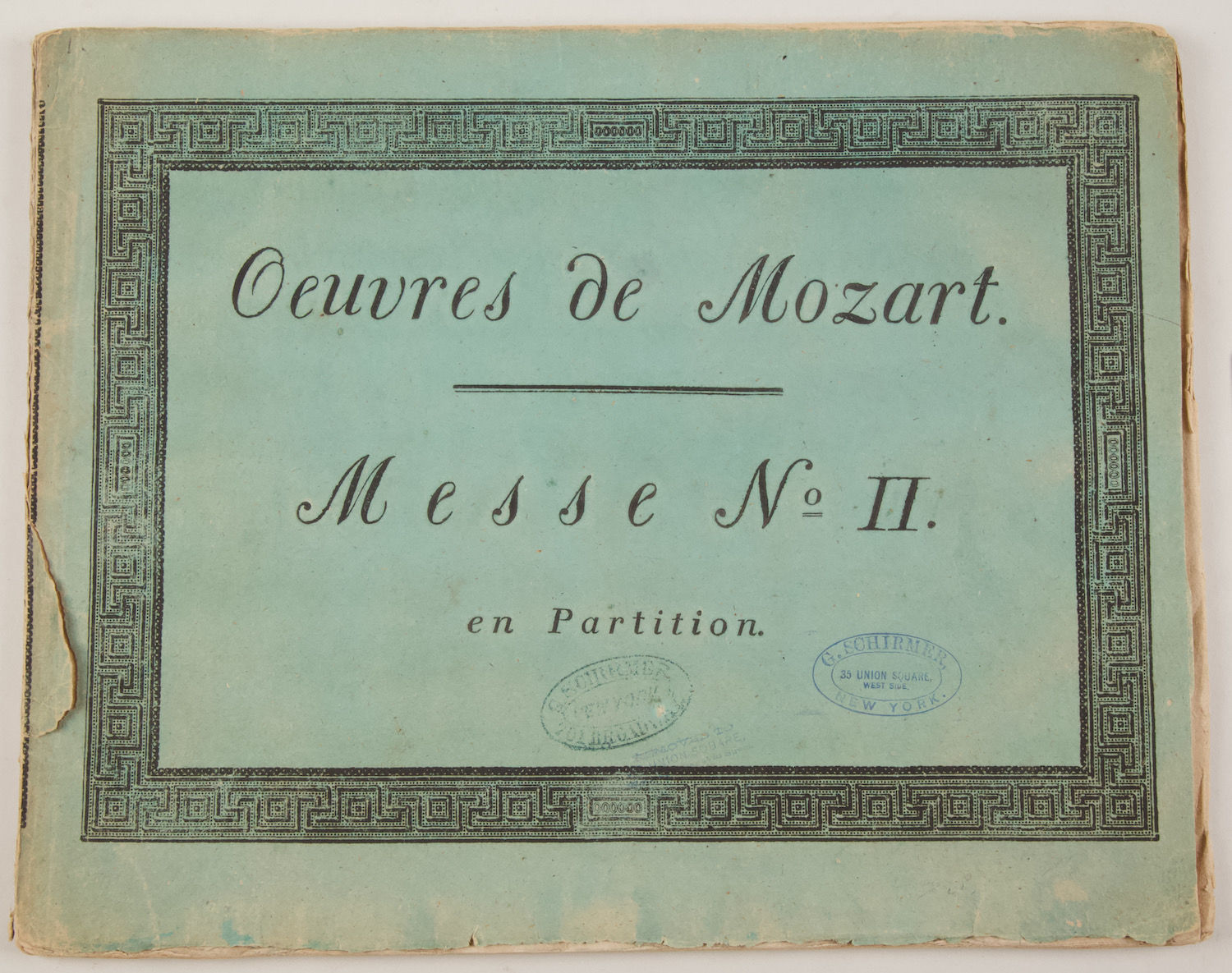 Wrappers slightly worn and faded; upper mostly detached; small oval stamps of G. Schirmer in New York. Moderately browned; occasional foxing; edges of some leaves frayed, soiled, creased, and chipped; publisher's stamps to foot of title. First Edition. Haberkamp I, p. 111. Köchel 6, p. 268. Hoboken 12, 718. Hirsch IV, 988. RISM M7369.