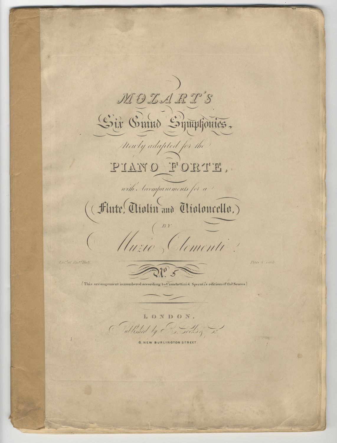 Mozart's Six Grand Symphonies. Newly adapted for the Piano Forte, with Accompaniments for a Flute, Violin and Violoncello, by Muzio Clementi. No. [5]. (This arrangement is numbered according to Cianchetti i & Sperati's edition of the Scores.). Price 8/ each. [KV 550]. [Parts]