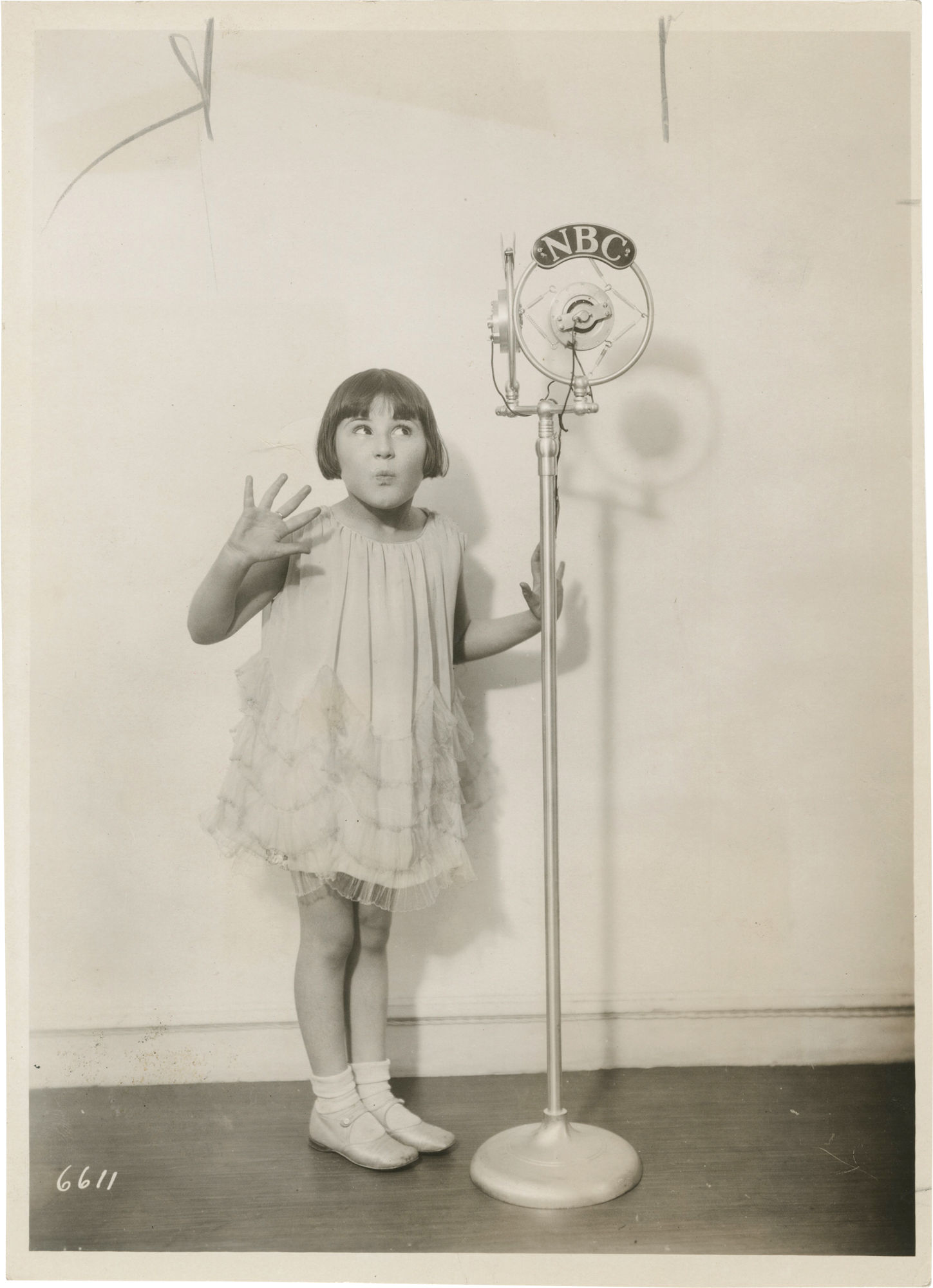 Burbank, CA: National Broadcasting Company [NBC], 1930. Vintage satin-finish double weight publicity photograph of young actress Rose Marie posing in front of a NBC microphone. With manuscript pencil annotations on the verso, along with a date stamp reading April 23, 1930, and a NBC stamp.