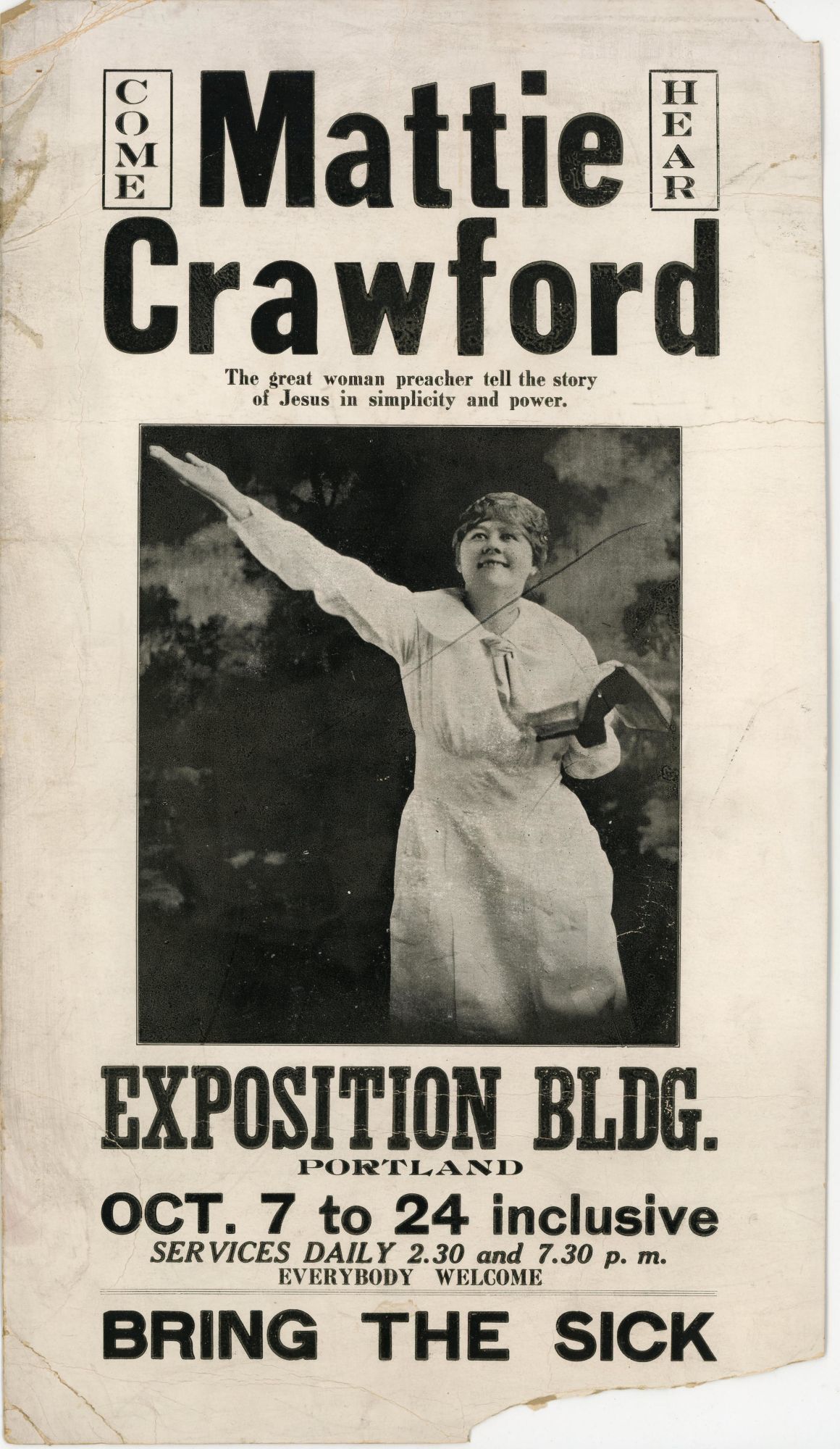 1930. Corner chips and bends.. A 17 1/2" x 10" heavy card stock poster The title reads Come Hear Mattie Crawford - The great woman preacher tell the story of Jesus in simplicity and power. This is followed by a somewhat ethereal appearing image from a photograph of Crawford in a white dress holding a Bible and pointing towards the heaven. The caption at base reads "Bring the Sick". The revival events were being held twice daily for 17 days at the Exposition Bldg. Portland (ME). The reverse is blank. Often controversial. |Born in Oklahoma in abt. 1904. Raised Catholic, she testifies of her own gradual healing and conversion after beginning to attend Protestant church revivals. An early believer in Trinitarian and Oneness, Assemblies of God she was a significant early Pentecostal leaders such along with Aimee Semple McPherson, the Crabtree family, and others.