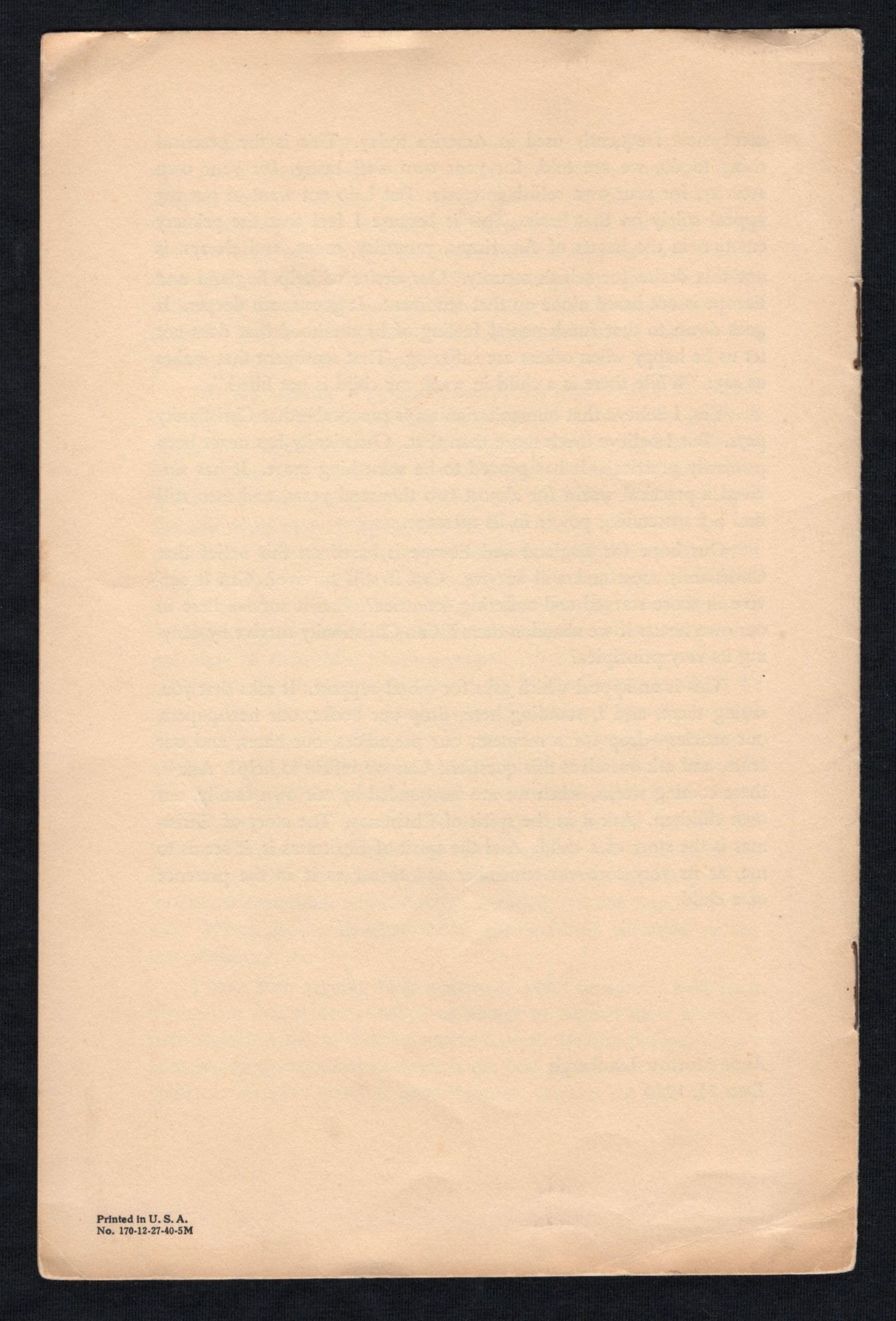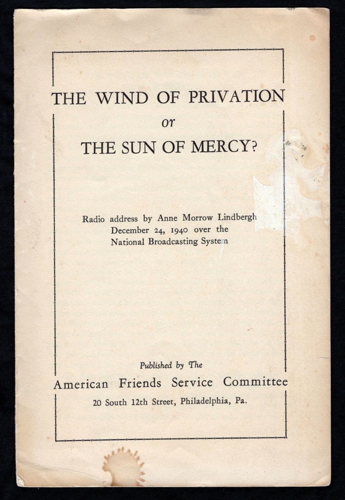 Philadelphia, PA: American Friends Service Committee, 1940. Minor stains and missing surface litho on front. Staples rusted.. Anne Morrow Lindbergh (1906-2001) was an American author and aviator. However her and her husband, Charles Lindbergh, are perhaps most well-known as the parents of Charles A. Lindbergh Jr., a baby who in 1932 was kidnapped for ransom from their home and later murdered. The booklet is the transcript of a radio address given by Anne on December 24, 1940, on behalf of the American Friends Service Committee (AFSC). The address was an appeal to America to help fund charity efforts to feed the citizens of Europe, who, by that time had been embroiled in WWII for little over a year. Anne argued for helping the civilians, particularly the women and children, not just in our allied countries, such as England and France, but also the people within the countries who had been conquered by Germany. She called this a "Christian duty", and furthermore, she argued against the notion that by feeding the citizens of the countries conquered by Germany, one was helping the enemy. She even took it one step further by stating that if American citizens didn't feed these people, and Germany did, Germany was more likely to win the hearts of the conquered citizens for no more than the cost of a loaf of bread. Anne was perhaps an unlikely choice for this address as it should be noted that Anne and her husband, Charles, had become enamored with Germany and Hitler, after they had moved to Europe to escape the media attention following the conclusions of the murder trial for their eldest son. The pair advocated for a US-Germany Non-Aggression Treaty and Anne published a short booklet in 1940 entitled "Wave of the Future" which argued for Fascism. The Roosevelt administration would call the booklet "the bible of every American Nazi, Fascist, Bundist and Appeaser." The couple did change their view points after the attack on Pearl Harbor. 5 pgs. Printed wrappers. Staple binding. OCLC 5 (Nov. 2020). Measures 9" x 6