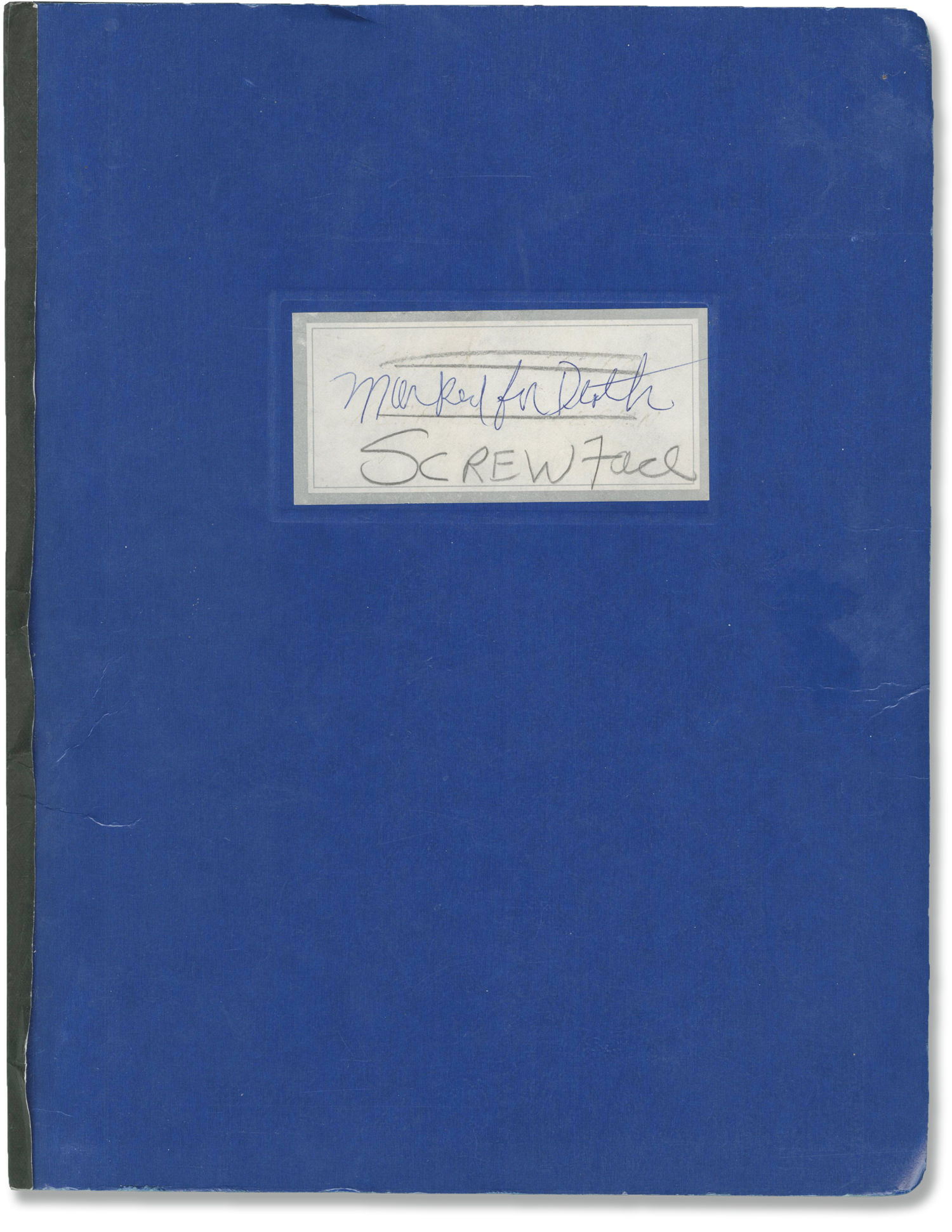 Los Angeles: SP Films, Inc, 1990. Revised Fourth Draft script for the 1990 film, here under the working title "Screwface." Annotations on label on front wrapper of "Screwface" in manuscript pencil, with "Marked for Death" above, in manuscript ink.