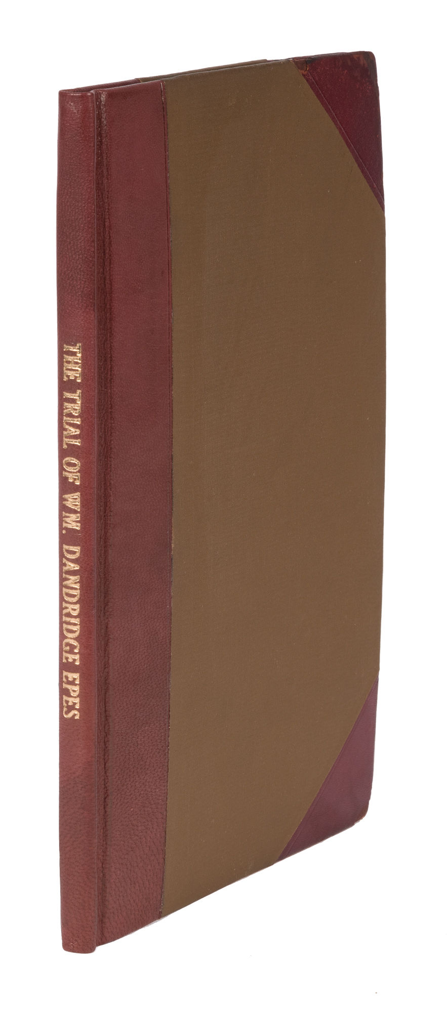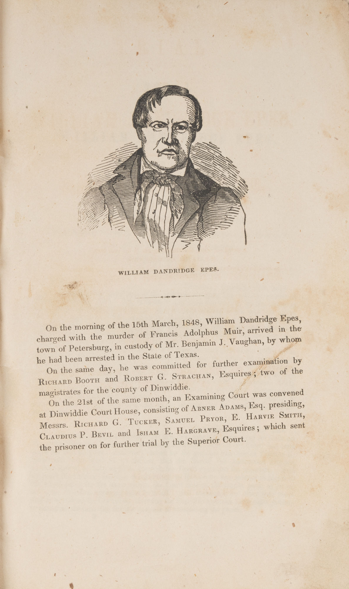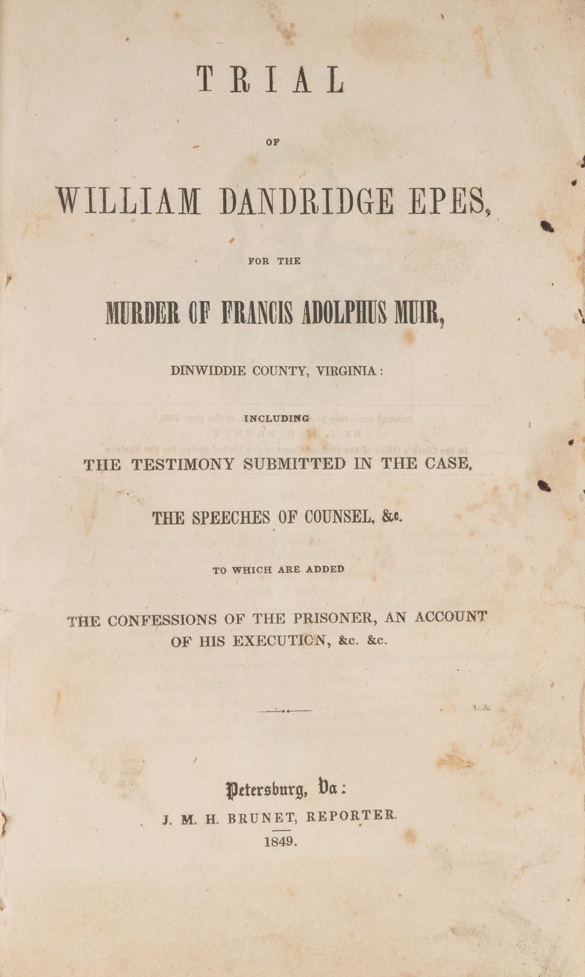1849. Petersburg, VA: J.M.H. Brunet, 1849. Petersburg, VA: J.M.H. Brunet, 1849. An 1849 Murder in Petersburg, VA: McDade 286 [Trial]. Epes, William Dandridge [1806?-1848], Defendant. Brunet, J[ames] M[onroe] H[amilton] [1817-1856], Reporter. Trial of William Dandridge Epes, For the Murder of Francis Adolphus Muir, Dinwiddie County, Virginia: Including the Testimony Submitted in the Case, The Speeches of Counsel, &c. To Which are Added the Confessions of the Prisoner, An Account of His Execution, &c. &c. Petersburg, VA: J.M.H. Brunet, Reporter, 1849. 76 pp. Woodcut portrait of Epes on p. 3. Octavo (9" x 5-1/2"; 22.6 x 14 cm). Stab-stitched pamphlet bound into later three-quarter calf over cloth, recently rebacked, gilt title to spine, endpapers renewed. Light rubbing to board edges, some wear to corners. Moderate toning to text, light foxing in a few places, light soiling and edgewear to title page, the following leaf and final leaf. $1,500. * "Muir threatened to foreclose [farm] property he had sold to Epes, so Epes shot his creditor and hid his body on the farm. He faked a series of letters to account for Muir's absence, but he pawned his victim's watch and led the police to his door" (McDade). OCLC locates 7 copies in law libraries (Harvard, Jenkins, Library of Congress, University of Missouri, University of Virginia, US Supreme Court, William & Mary). McDade, The Annals of Murder 286. Brown, "Accounts of Trials" in Virginia Law Books: Essays and Bibliographies (Bryson, ed.) 149.