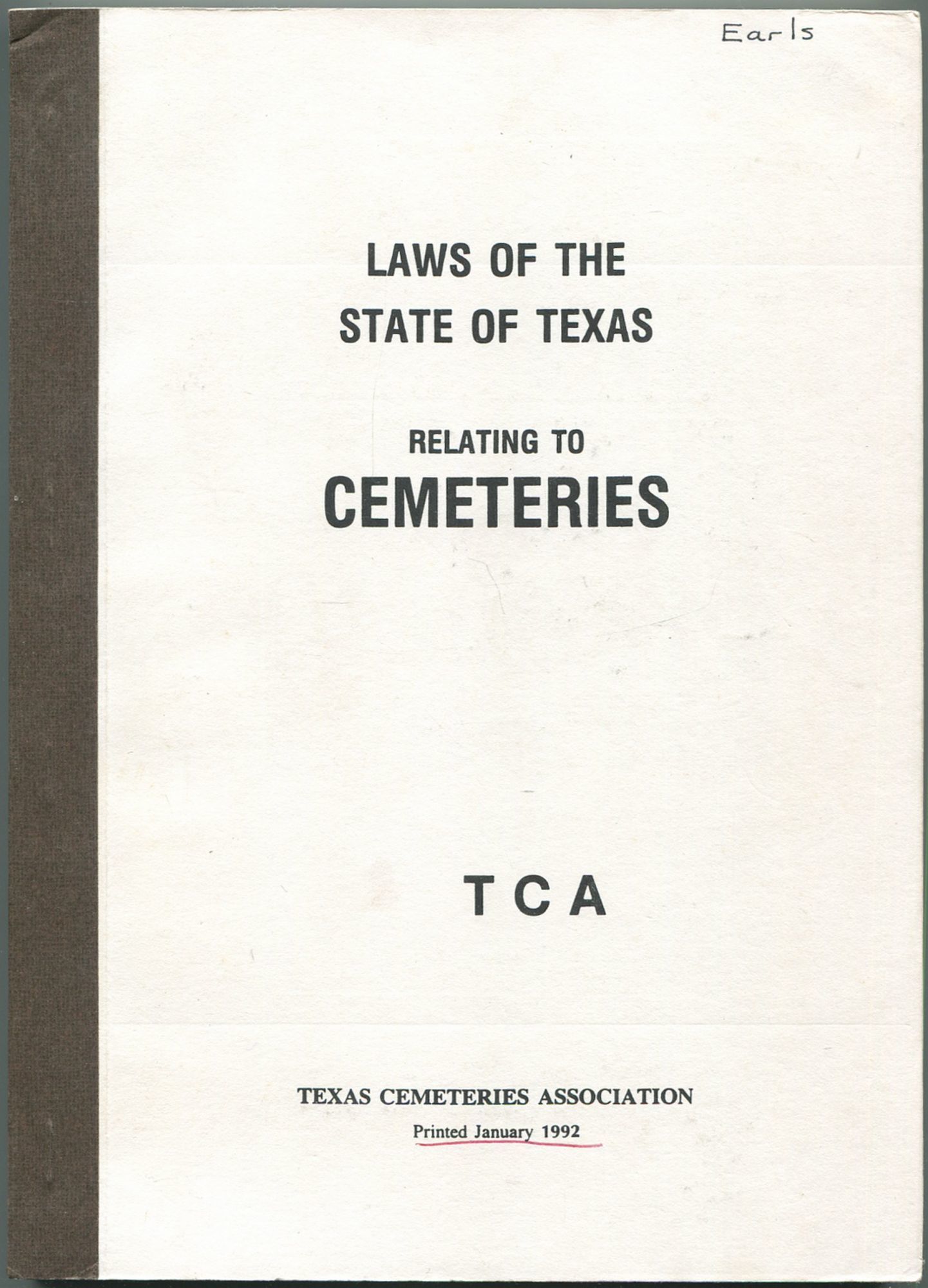 [no place]: Texas Cemeteries Association, 1992. Softcover. Very Good. Reprint. Small quarto. Paginated variously, approximately [200]pp. Paper-backed stapled card covers. Title inked in pink on spine, inked owner name on cover and first leaf, some highlighting within, short splits at the spine head, very good. "This booklet contains reprints of the West Publishing Company publications of the laws of the state of Texas relating to cemeteries as of the close of 1991," 18 in total. Uncommon.