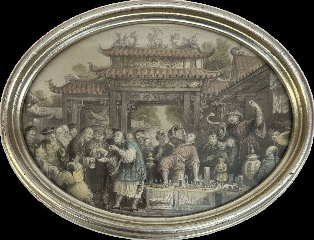 [c. 1830].  An oval tinted engraving of an outdoor scene, featuring snake charmers and their audience; some colors present; framed; not matted; not examined out of frame; back covered with paper; framer's sticker at back; text at back reads "Snake Charmers 19th Century c. 1830"; very good condition. Dimensions in frame: height 6 inches x width 8 inches; dimensions from sight: height 4 3/4 inches x width 6 1/2 inches. Located at Dupont store. 1342869. Arts & Antiques.