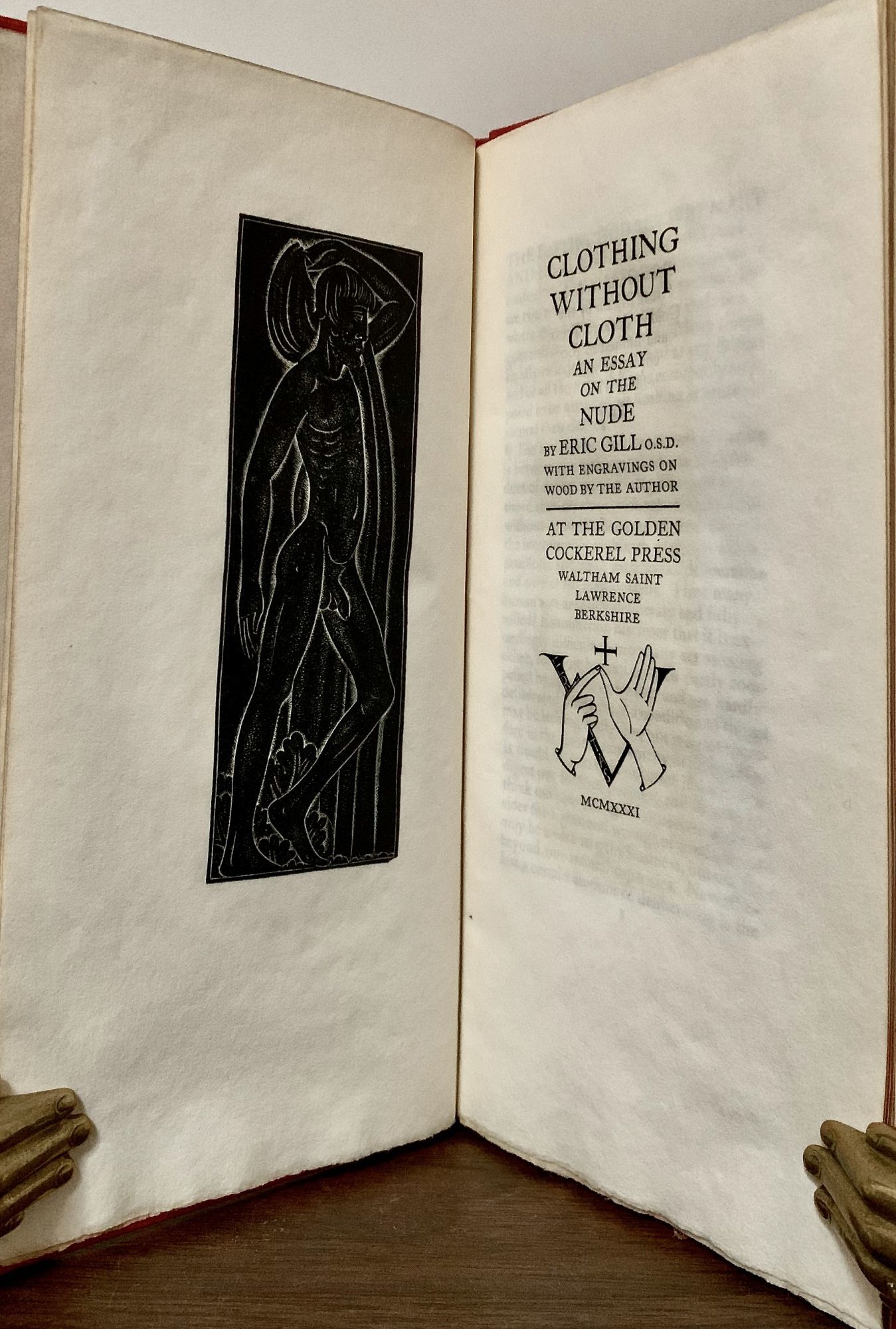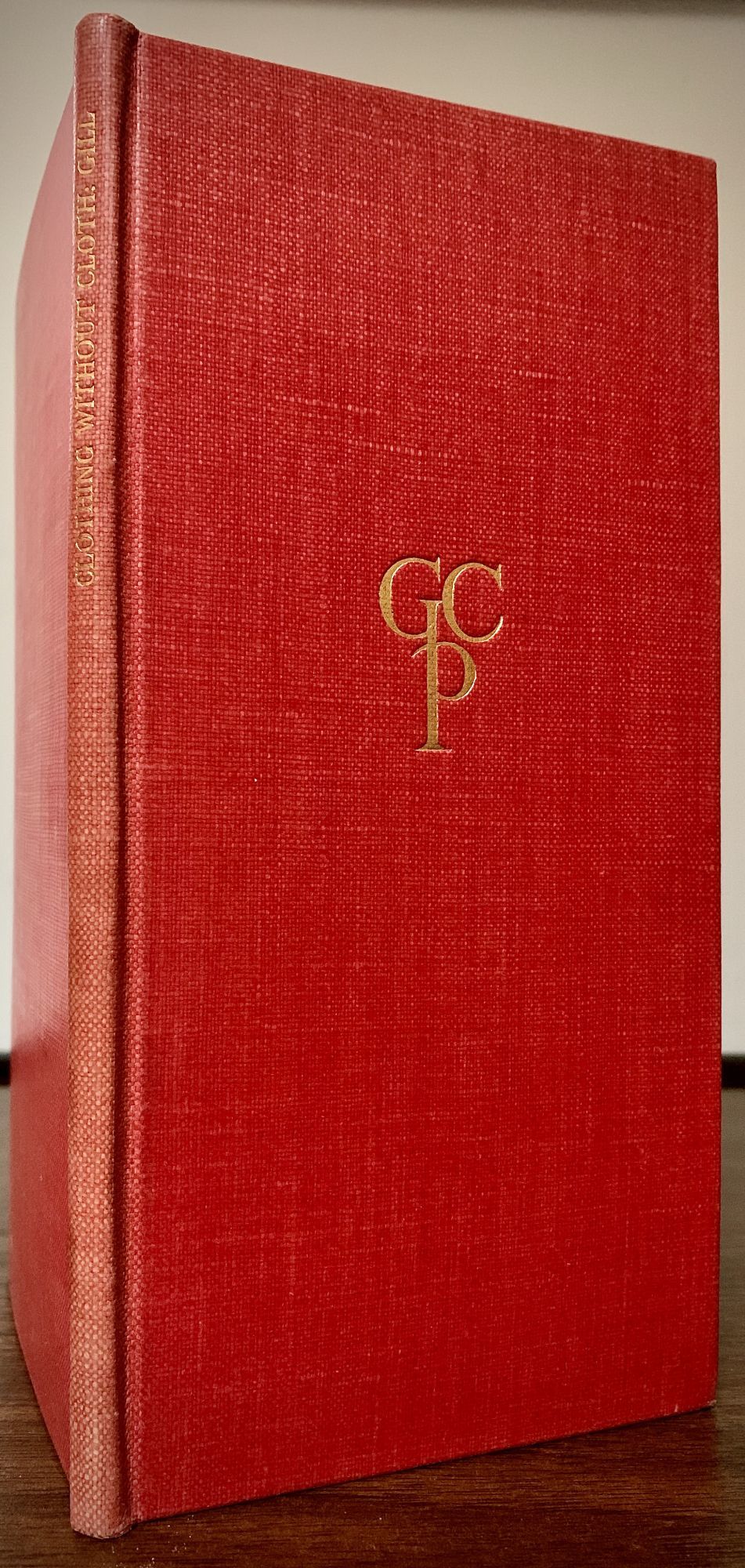 Waltham Saint Lawrence: Golden Cockerel Press, 1931. First edition. Hardcover. Orig. scarlet buckram. Aeg. Fine. Gill, Eric. 20 pages. 23 x 11.5. Four wood engravings on wood by Gill. Limited edition, copy 204 of 500. 12 pt. Caslon O.F. type. CHANTICLEER 75. "The first of the `Saddle-back' Cockerels. The page is twice as high as it is broad, and the `double-opening' consequently square.