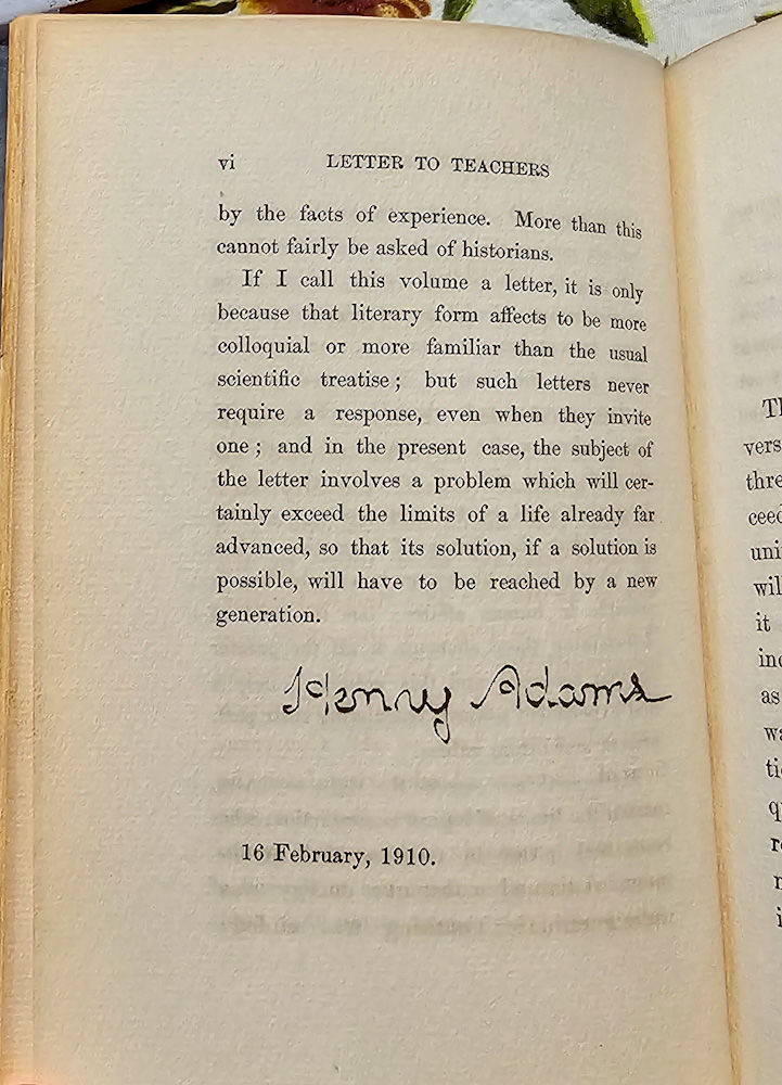 Washington DC: (J. H. Furst), 1910. First Edition. Hardcover. A close to Fine copy. Publisher's green cloth; vi, 214, [2] pages. SIGNED by the author at the end of the introductory letter, as with many copies. BAL 34. One of a series of late works by Adams in which he tried to incorporate new scientific knowledge, especially in physics, into the study of American history.