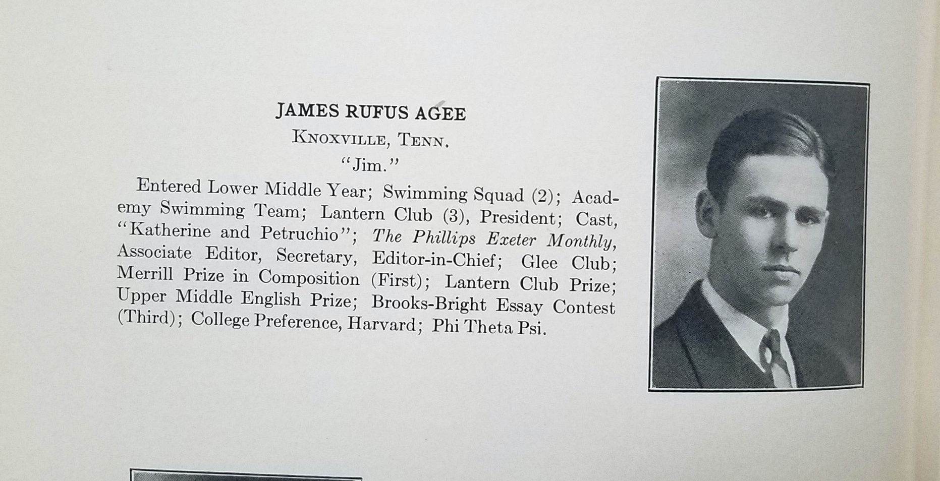 (Exeter, NH): (News-Letter Press), 1928. First Edition. Hardcover. Bookplate of a senior class member on the front pastedown. Light foxing to a few pages at beginning and end, no writing inside; light rubbing to covers. Very Good. The 1928 yearbook for The Phillips Exeter Academy, James Agee's senior year, with 13 references to him including his senior photo with description, and 7 other photographs including him. In addition to belonging to the drama club and swim team, Agee won several prizes including the Merrill Prize for his composition "Catched." Uncommon survival and a glimpse of the young writer's life.