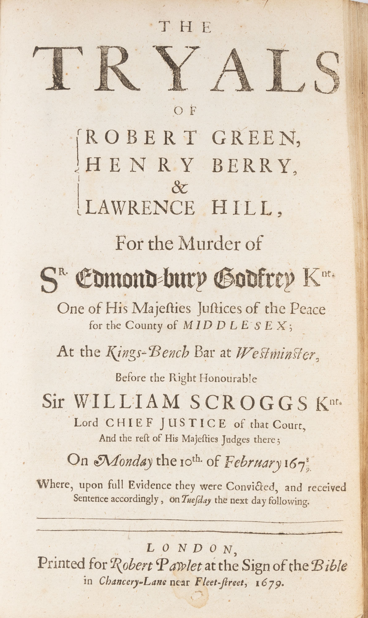 1679. Victims of the Popish Plot of 1678 [Trials]. [Popish Plot]. [Green, Robert (d.1679)], Defendant. [Henry Berry, Henry (d.1679)], Defendant. [Hill, Lawrence (d.1679)], Defendant. The Tryals of Robert Green, Henry Berry, and Lawrence Hill, For the Murder of Sr. Edmond-bury Godfrey, Knt. One of His Majesties Justices of the Peace for the County of Middlesex; At the Kings-Bench Bar at Westminster, Before the Right Honourable Sir William Scroggs Knt. Lord Chief Justice of the Court, And the Rest of His Majesties Judges There; On Monday the 10th of February 1678/9. Where, Upon Full Evidence They Were Convicted, And Received Sentence Accordingly, On Tuesday the Next Day Following. London: Printed for Robert Pawlet, 1679. [iii], 92 pp. With an imprimatur leaf. Folio (11" x 7"). Recent period-style quarter calf over marbled boards, negligible light fading to spine. Moderate toning to text, minor stains and spark burns to a few leaves, light soiling to title page "4" in tiny hand to its upper margin. $450. **DESCRIPTION TRUNCATED DUE TO CHARACTER LIMITS. PLEASE CONTACT US FOR A COMPLETE VERSION.** * Only edition. One of the cruelest hoaxes in British history and the inspiration for a wave of anti-Catholic violence, the Popish Plot was the invention of Titus Oates, an Anglican clergyman, and his friend, Dr. Israel Tonge, a cleric and passionate anti-Catholic. They pretended to have discovered a Jesuit plot to assassinate the King, massacre Protestants, and set James, Duke of York, the King's Catholic brother, on the throne. The trial of Green, Berry and Hill was one of its most shameful episodes. In October 1678 Godfrey, a justice of the peace to whom Oates first described the plot, was found dead in a ditch, apparently the victim of murder. The Catholic community was blamed and Green, Berry and Hill were eventually hanged for his murder. Many questions about this case remain, however, including the exact circumstances of Godfrey's death. One theory holds that Godfrey was killed by Oates and his supporters to underpin their own invented plot, another that he was murdered for reasons unconnected with any Catholic plot. It is also possible that Godfrey committed suicide; when his body was found it was manipulated to fit the plot scenario. In any event, Godfrey was buried in an elaborate funeral as a martyr to the Protes.