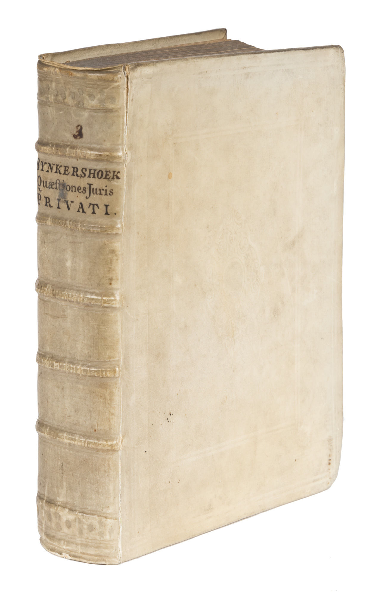 1744. Leiden: Apud Joannem van Kerckhem, 1744. Leiden: Apud Joannem van Kerckhem, 1744. Scarce Treatise on Private Law by an Important Dutch Jurist with the Uncommon Folding Portrait Plate Bynkershoek, Cornelius van [1673-1743]. [Pauw, Willem, Editor]. Quaestionum Juris Privati Libri Quatuor: Quarum Plerisque Insertae sunt Utriusque in Hollandia Curiae Res de His Ipsis Quaestionibus Judicatae. Leiden: Apud Joannem van Kerckhem, 1744. [xxviii], 744, [16] pp. Folding 17" x 10-1/2" portrait copperplate, often lacking from copies of this work, bound before p. 1. Quarto (7-3/4" x 6"). Contemporary paneled vellum, corner fleurons and large central arabesques to boards, raised bands and early hand-lettered title to spine, "3" in tiny early hand to head of spine. Light soiling, boards slightly bowed, moderate rubbing to extremities, spine ends bumped, front joint starting at ends, corners bumped, illegible later signatures in tiny hand to recto and verso of front free endpaper. Title page, with large copperplate vignette, printed in red and black. Light to moderate toning, faint dampstaining in a few places, light soiling to title page. $1,250. * First edition. One of the most important jurists of his time, Bynkershoek was a Dutch jurist who founded the positive school of law, which held that usage and practice were more important than deductions drawn from natural law. Respected during his lifetime, his works are still consulted today. Best known for his works on international law, he also wrote important works on other legal topics, such as the present work, which considers questions dealing with private law under the Roman and Roman-Dutch systems. Published posthumously, an edition in Dutch was published in 1747. The final edition, in Latin, appeared in 1752 as part of a collected-works edition. All are scarce. OCLC locates 6 copies of the first edition in North American law libraries (Harvard, NY Law Institute, UC-Berkeley, University of Iowa, University of Michigan, UVA). Dekkers, Bibliotheca Belgica Juridica 16.