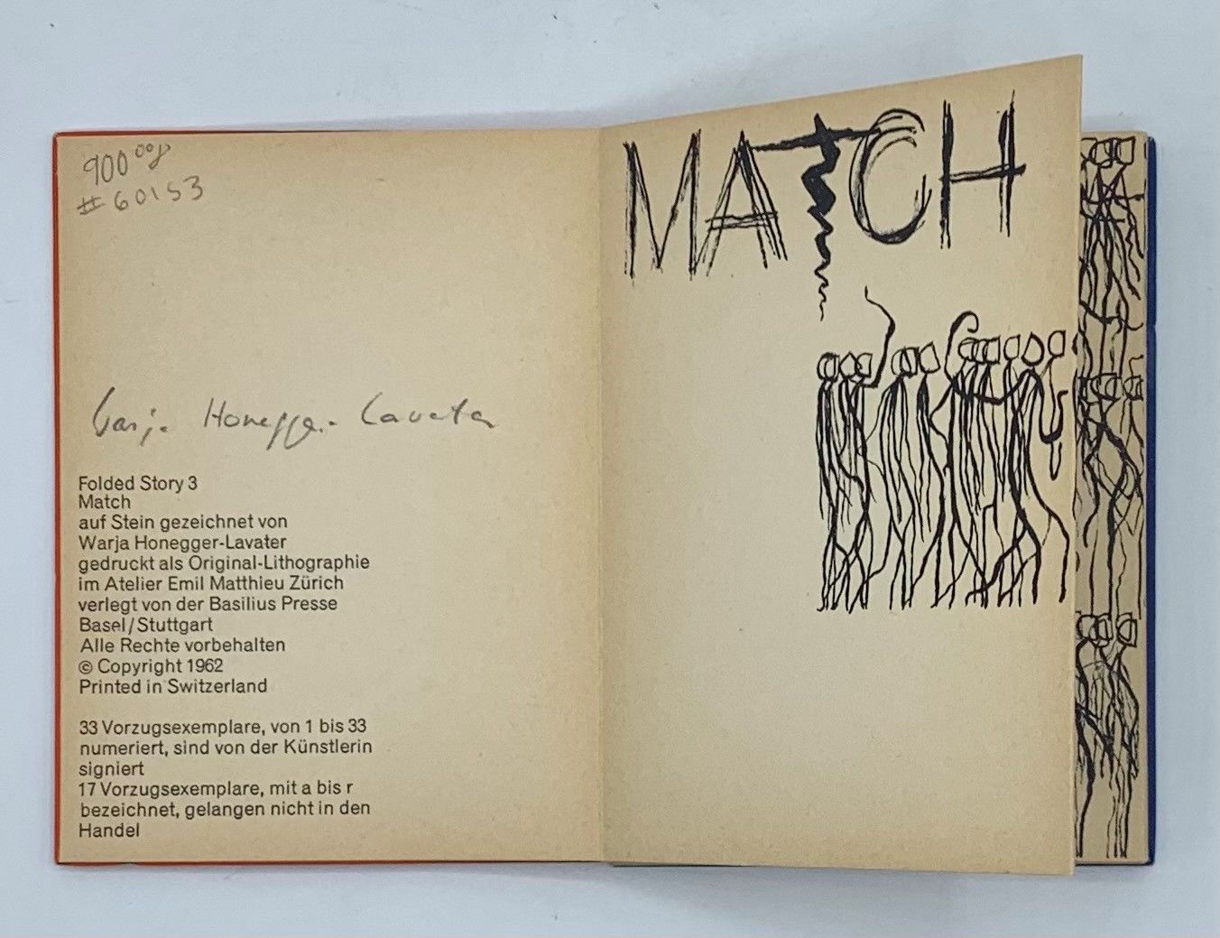 Basel / Stuttgart: Basilius Presse, 1962. First edition. Very good. SIGNED. Twenty-fourmo [12 cm] Accordion-folding artist's book composed of orange and blue paper over boards with folding black and white lithographic interior. Light soiling and rubbing to the boards; boards just a little concave; pages toned. Printed from the original lithographs at Atelier Emil Matthieu in Zürich. Not numbered. The publication information is in German and English. One of Lavater's earlier folded stories. The Basilius Presse was the first to publish Lavater's artists' books. This copy is signed by the artist in pencil on the copyright page.