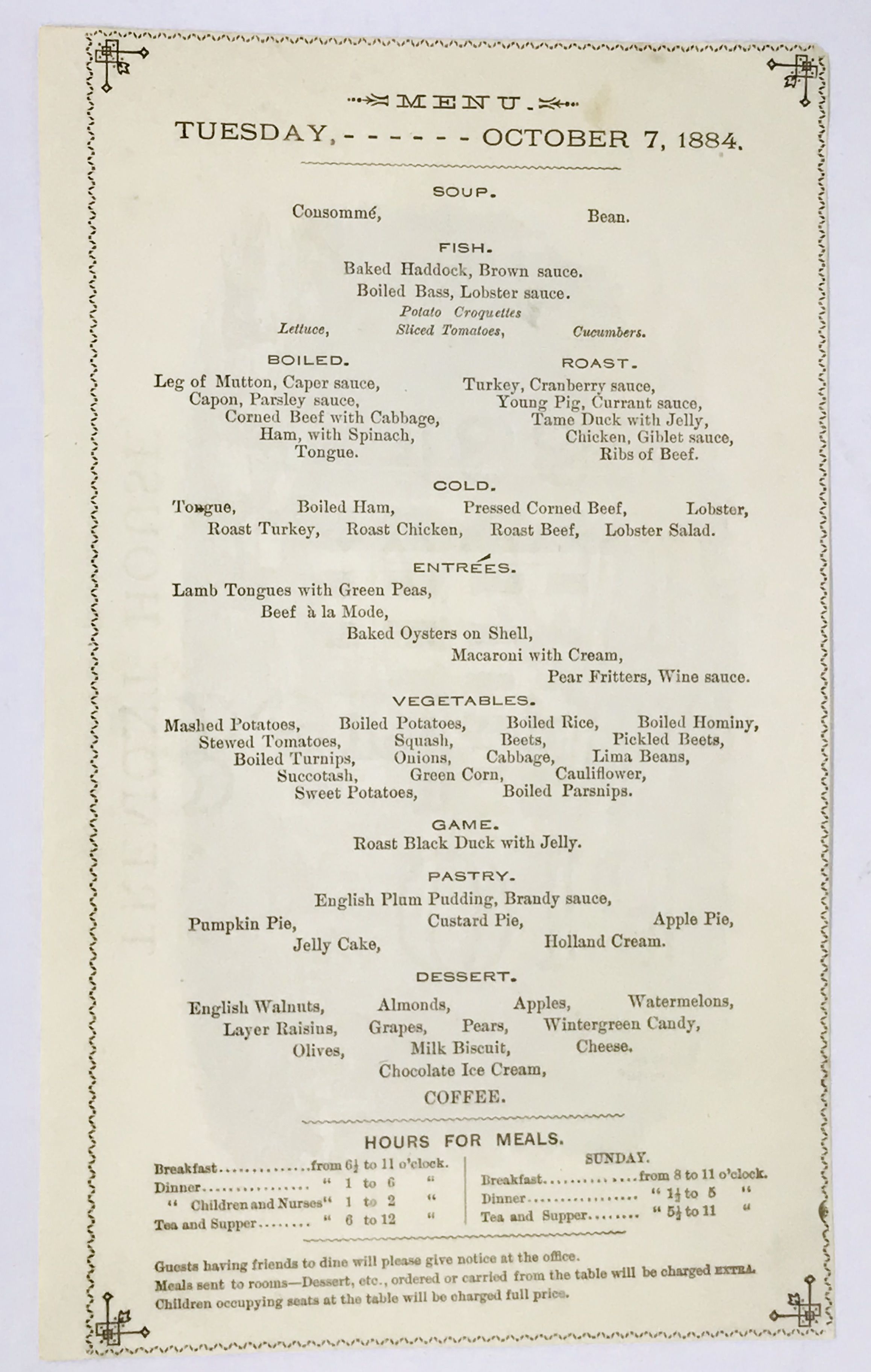 The dinner menu for Sunday, December 25th, 1938 was crowded with a wide array of European inspired delights and many fish dishes - Caviare Baton, Tortue Claire, Tay Salmon, Cape Lobster, along with Lamb, Turkey, Pheasant Capon, and an assortment of desserts. Light foxing to interior, covers clean.
