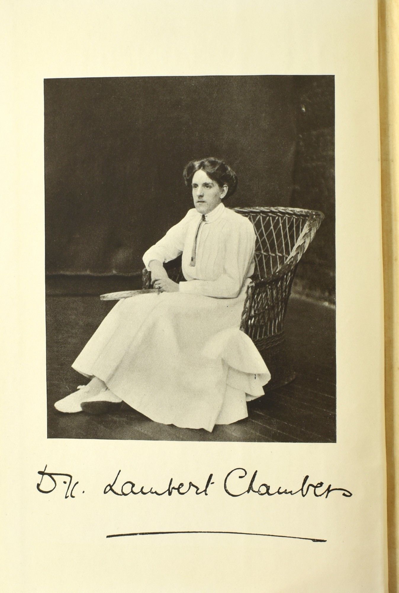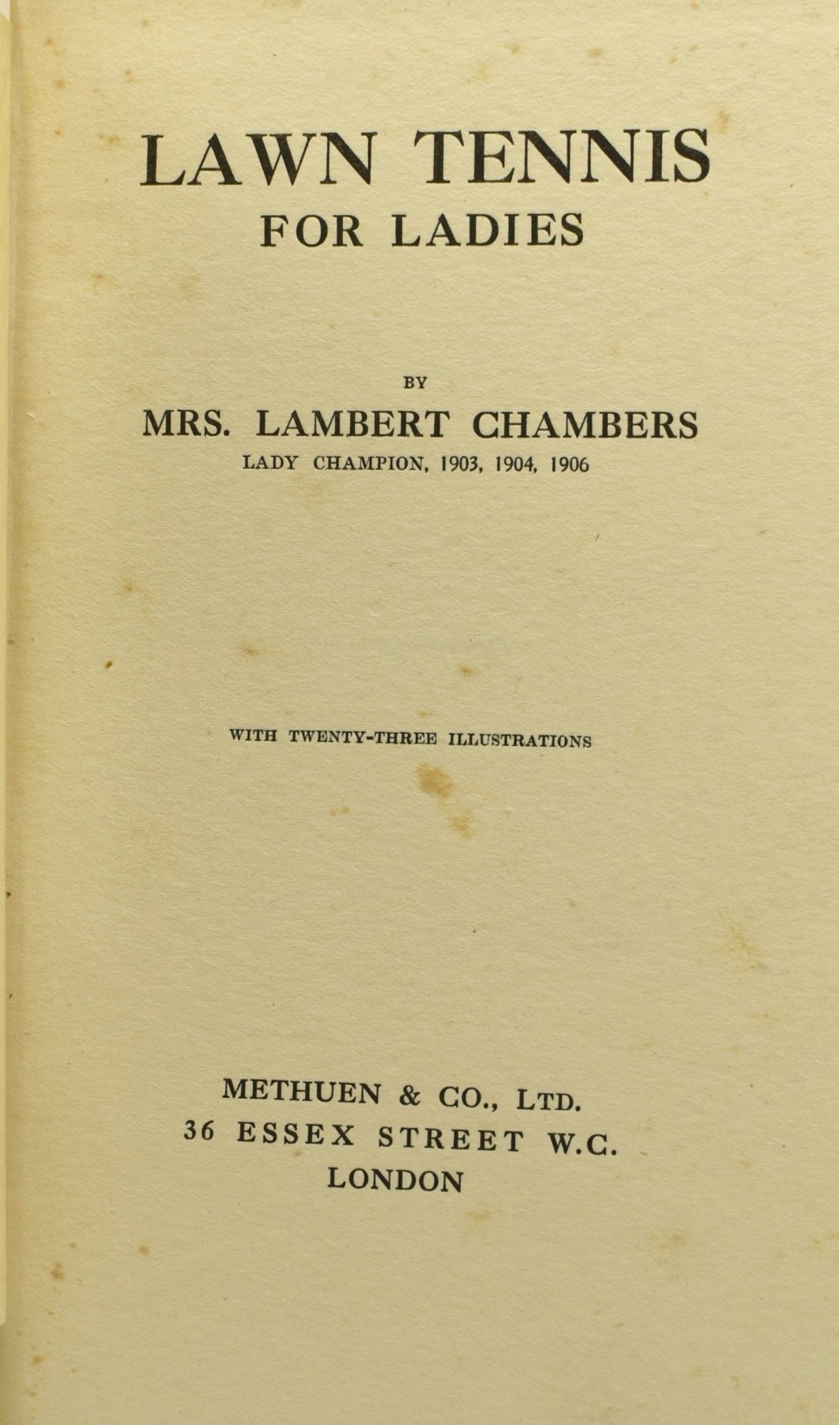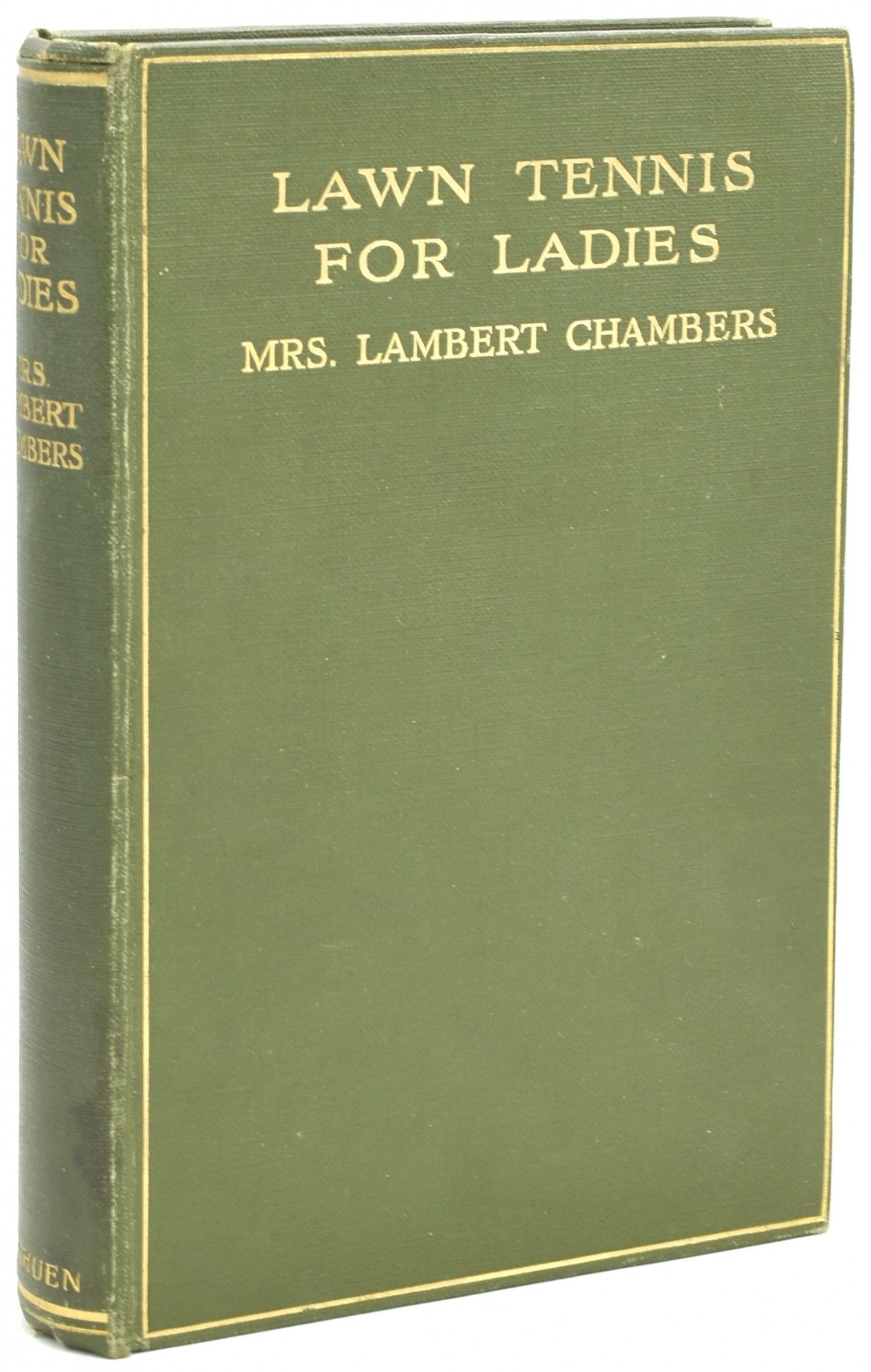 London: Methuen and Co., Ltd, 1910. First Edition. Hard Cover. Very Good binding. 8vo.; in the publisher's green cloth binding ruled in gilt at the perimeter of the upper board, with gilt titling; xii, 135 pages, including the Index; with all photographic plates present as called for; with [6] pages of publisher's ads, followed by a 30 page publisher's catalogue; there is some scattered foxing but no prior ownership marks of any kind.~~A bright copy of this tennis memoir wich contains photos of tennis technique as well as advice on attire! Mrs. Chambers won seven ladies single titles at Wimbledon. ~~Uncommon in commerce, and not overly represented in institutional holdings.~~. Very Good binding.