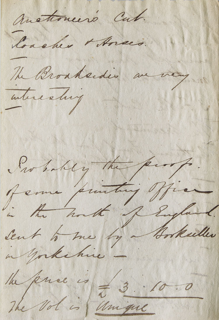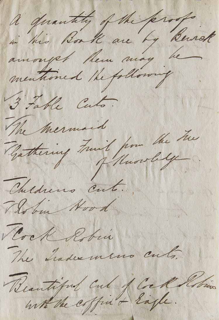 With an early note laid in: "A quantity of the proofs in this Book are by Bewick amongst them may be mentioned: 3 Fable cuts, The Mermaid, Gathering Fruit from the Tree of Knowledge, children cuts, Robin Hood, Cock Robin, ... Probably the proof of some printing office in the north of England sent to me by a bookseller in Yorkshire. The price is £3.10.0. The volume is unique.