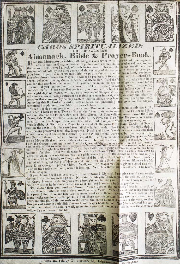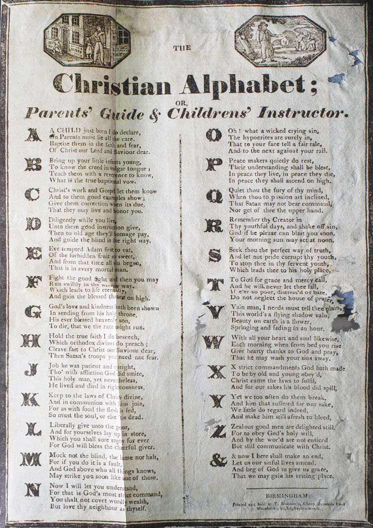 8 x 6-1/2 inches. Contemporary half calf, hinge off. Largely disbound, some proofs apparently extracted. 8 x 6-1/2 inches. Bound with two broadsides: 1. Cards Spiritualized: Almanack, Bible & Prayer Book. Printed and Sold by T. Bloomer Edgbaston-street, Birminghamn (13-3/4 x 8-3/4 inches) 2. The Christian Alphabet or, Parents' Guide & Childrens' Instructor ; T. Bloomer's, Cheap Juvenile Book Warehouse...(13 x 8-3/4 inches) and over 100 proofs of blocks (some with many vignettes, a few by Bewick), mounted to blue paper.
