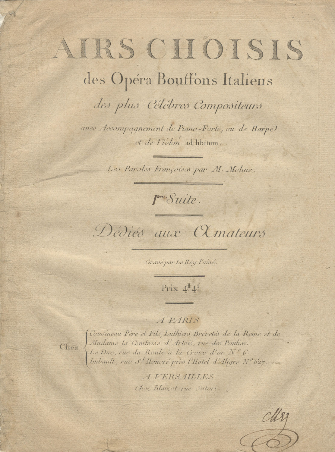 This collection "dédiés aux amateurs" speaks to the popularity of comic Italian opera in Paris in the late 18th century. Bernardo Mengozzi, along with his wife soprano Anna Benini, "went to Versailles during the summer of 1787 with other singers from the Haymarket for performances of Italian opera buffa; they then settled in Paris, and in 1789 joined the company of the Théâtre de Monsieur, where Mengozzi became famous both as a singer and as the composer of many substitute arias. His L’isola disabitata is a landmark in the history of opera in France, being the first serious opera performed in Italian in Paris since Cavalli’s Ercole amante. The most successful of his French operas seem to have been Isabelle de Salisburi and Selico, principally because of their spectacular element. Under the Directory Mengozzi spent some time in Bordeaux, and then returned to Paris to teach singing at the Conservatoire; he took an active part in the writing of the Méthode de chant du Conservatoire de Musique (1804) in collaboration with Garat, Cherubini and Langlé." Michel Noiray in Grove Music Online.