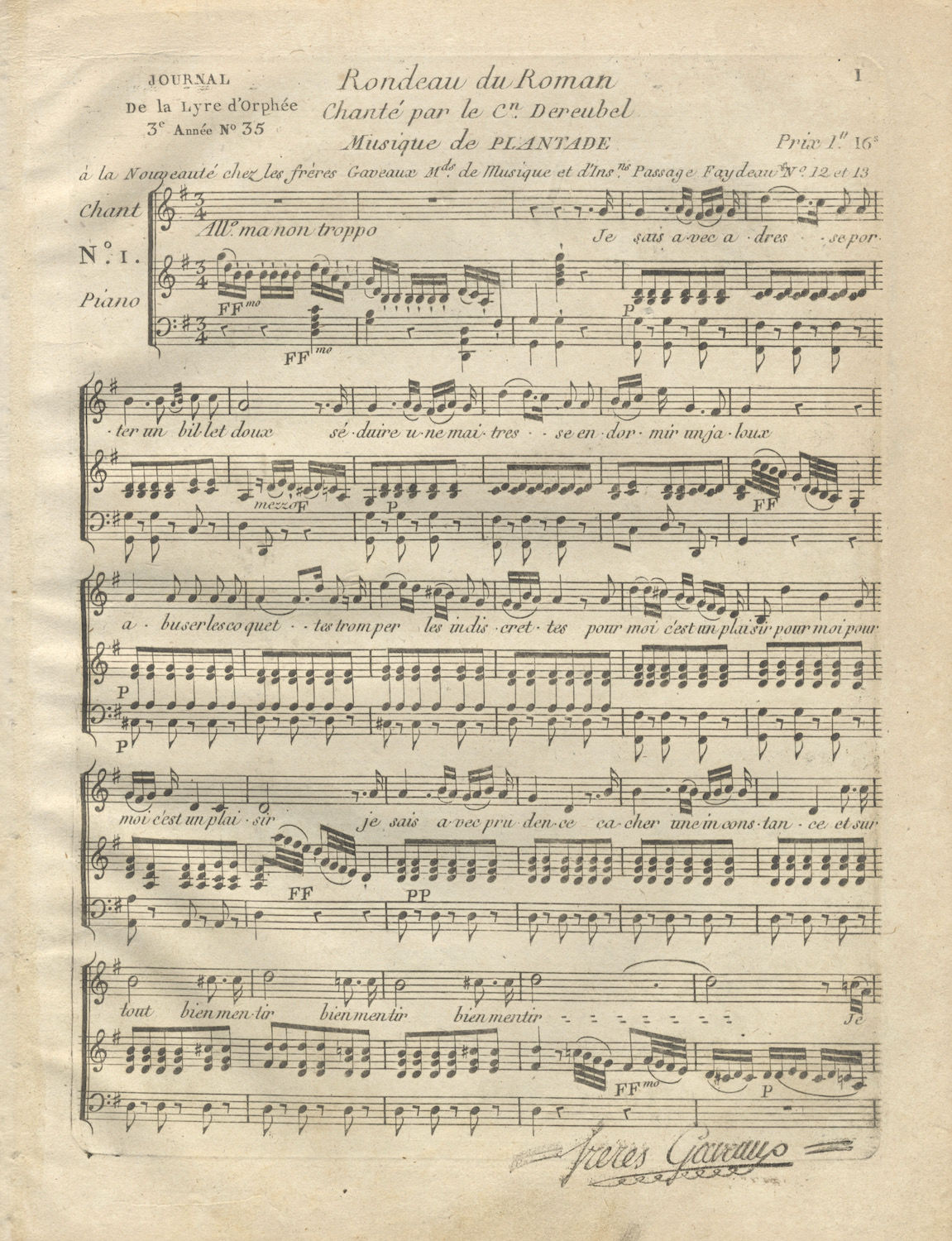 With text commencing "Je sais avec adresse porter un billet doux" from Plantade's opera Le Roman.