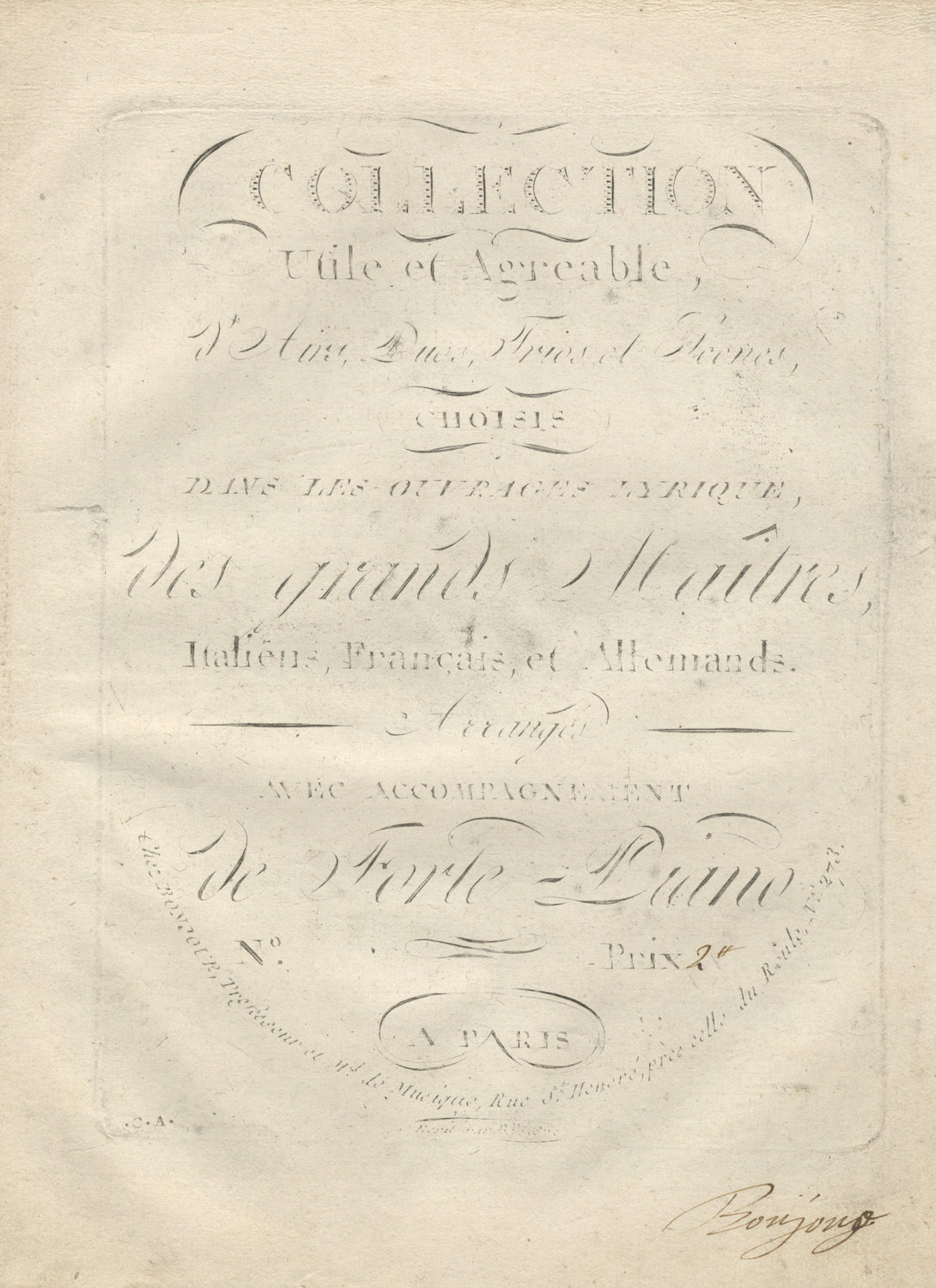 Series title: "Collection Utile et Agreable, Airs, Duos, Trios et Scènes, choisis dans les ouvrages lyrique des grands maîtres, Italiens, Français, et Allemands. Arrangés avec accompagnement de Forte-Piano No [blank] Prix [2tt]."