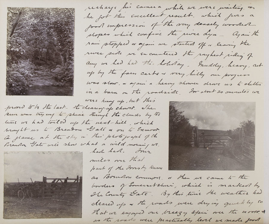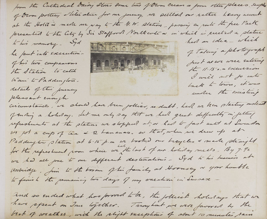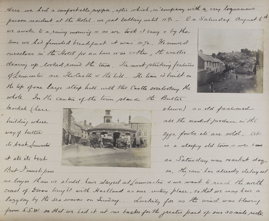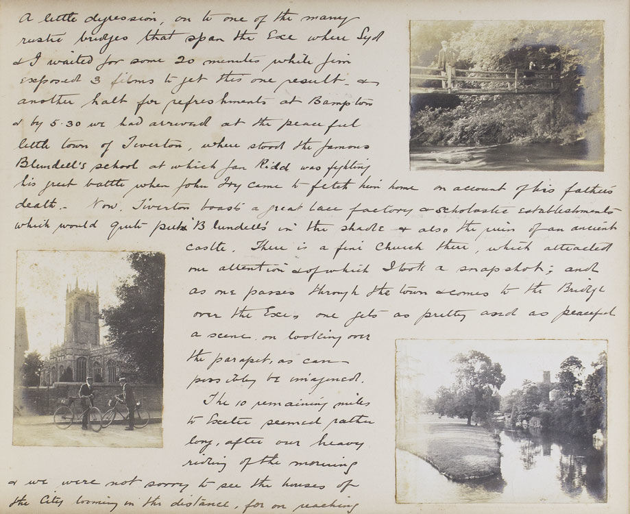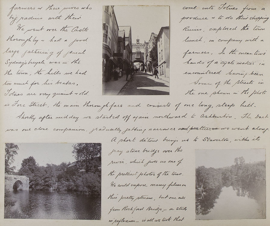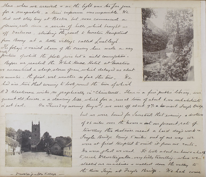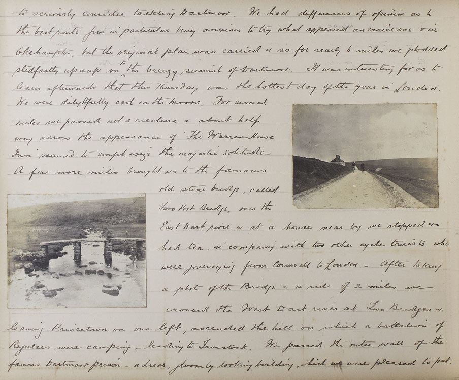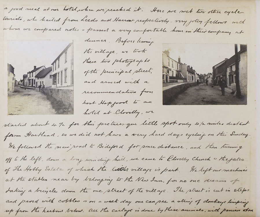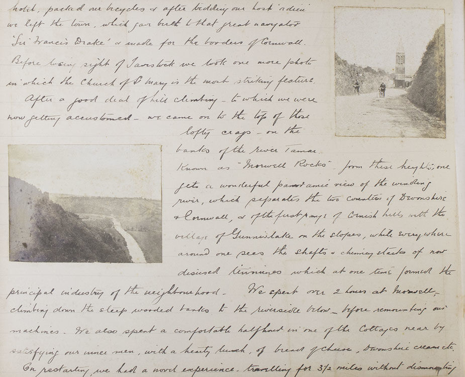 The excursion begins with an overnight train from Paddington to Teignmouth, in a compartment as comfortable ‘as a 3rd Class G.W.R. carriage would allow’. The intrepid cyclists then take in a leisurely tour of the Devon coast, visiting Maidencombe, Torquay, Paignton (‘a little disappointing’) and Brixham, before heading inland on a steamer up the river Dart, to Totnes, Buckfast Abbey, and Dartmoor. From Dartmoor they head west through Princetown, home of the infamous Dartmoor Prison, to the banks of the Tamar River, where the party crosses into Cornwall. Several days are spent meandering the Cornwall-Devon borders, before heading back up the North Devon coast to to Lytham, Lymington, Barnstaple (via the now defunct narrow-guage Lynton & Barnstaple Railway) and Ilfracombe. Several interesting events occur over the course of the trip. In Clovelly, for example, the author notes, ‘we have discovered that Earl Russell was staying in the village,... and later we saw his motor A.1. the first registered car in London...’. On the Ilfracombe stretch of their journey they reach ‘the little seaside village - made famous by Marie Corelli - Coombe Martin’. G.A.C. notes, ‘At “The Dolphin” we put up for lunch and lunched in the room where the famous authoress wrote the greater part of “The Mighty Atom”’. Many of the observations are of a topographical nature, and often accompanied by relevant photographs taken by members of the group. Syd, Jim and G.A.C. feature in many of the snapshots, always impeccably attired in their tweed cycling attire and boater hats. The tour ends on the 18th of August, with the party retracing their steps and returning to Paddington. The author concludes, ‘we had the jolliest tour of our lives (to this statement we all agree) in the famous West Country’.