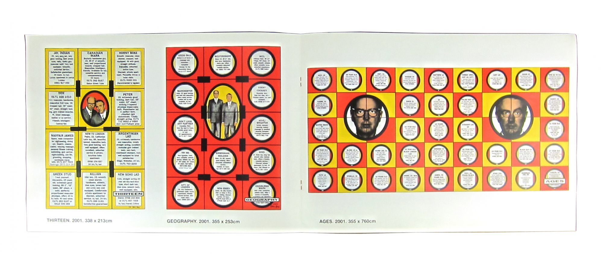 For this exhibit, Gilbert & George compiled tables of gay male personal ads arrayed in rows. Only G&G know how fictive the ads may not be. They begin as mechanical, repetitive Bergsonian comedy but add up to a tender, ongoing recognition of the humanity of the whole personal ads process.