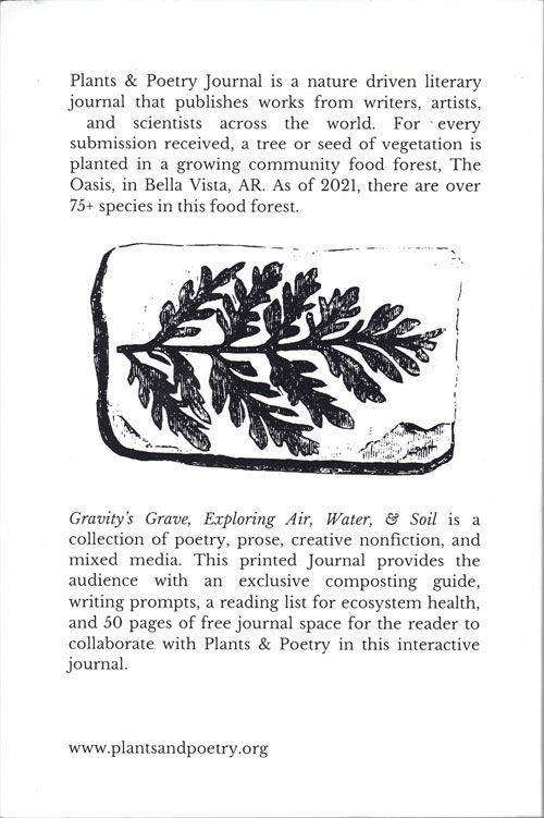 Bella Vista, AR: Plants and Poetry Journal, 2021. Paperback. New/New. 99pp. Octavo [22.8cm]. Pictorial wraps. White spine with black lettering. Plants & Poetry Journal is an online nature inspired literary journal publishing poetry, prose, & art by artists and writers from around the globe. The printed version of Gravity’s Grave, Exploring Water, Air, & Soil is an interactive journal with prompts, a compost guide, 50+ pages of journal space, and more aligning with people, community, and landscapes.