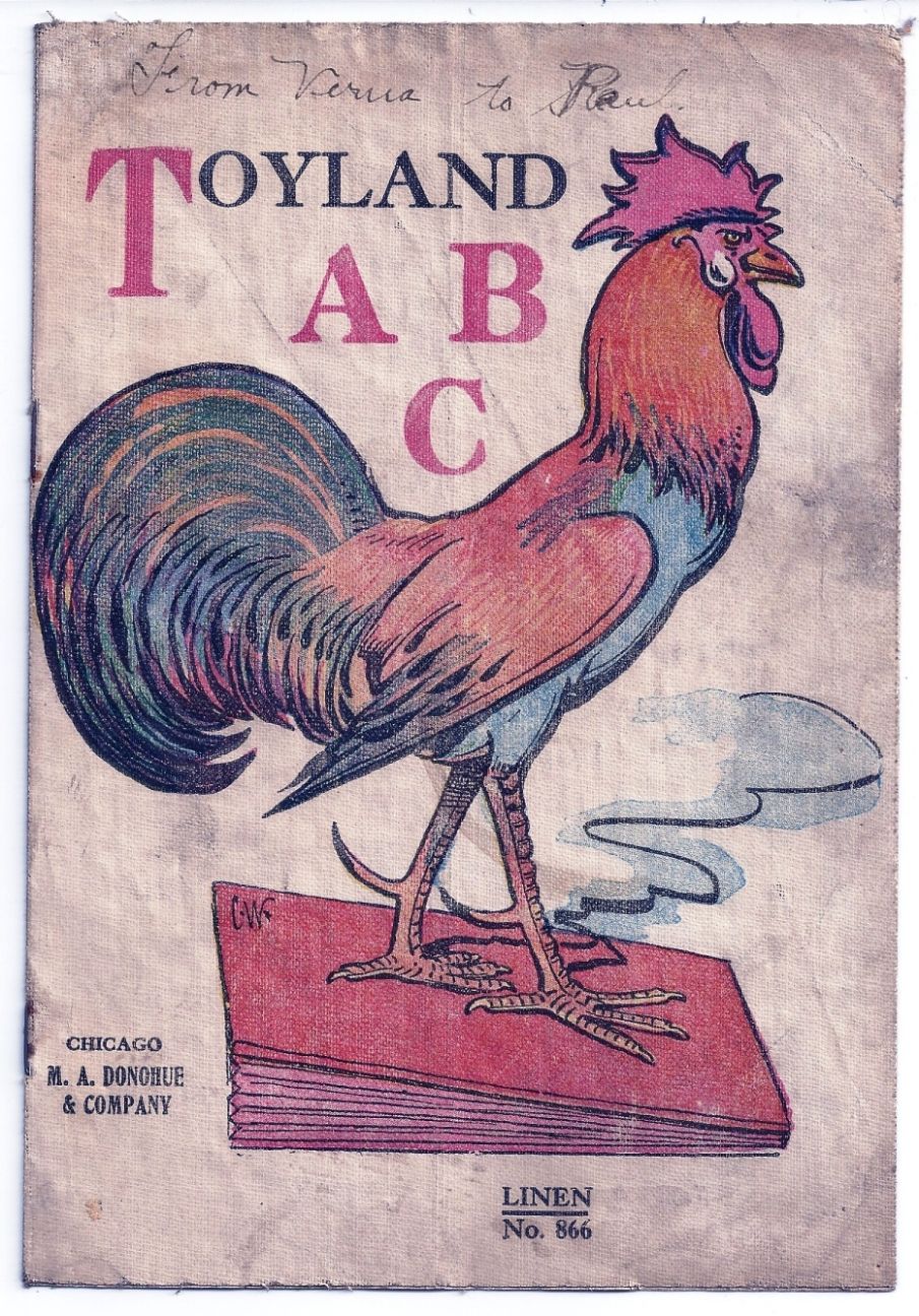 Chicago: M. A. Donohue & Company, n.d. [early 1900s]. Softcover. Early owner inscription on front cover; both covers soiled. About Very Good. Pictorial linen; 8 pages including covers. Front cover, which depicts a rooster, and rear cover along with two internal pages in color. A few images are negative stereotyped depictions of African-Americans including a Golliwog and a Mammy.