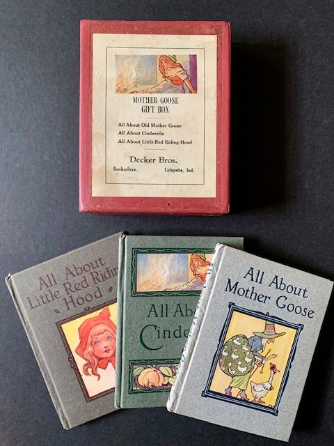 New York: Cupples & Leon, 1916. Pictorial boards. Near Fine. Johnny Gruelle. (GRUELLE,JOHNNY) illus. MOTHER GOOSE GIFT BOX: THREE "ALL ABOUT" BOOKS BY GRUELLE. NY: Cupples & Leon (1916). The box has a pictorial label and measures 4 1/2 x 6" and except for slight soil is in Near Fine condition. Inside the box are 3 titles in the "All About" series, bound in pictorial boards with color labels. They are in Fine condition, each featuring 8 color plates and pen and ink drawings in text. Titles include All About Old Mother Goose, All About Cinderella and All About Little Red Riding Hood. A wonderful item.