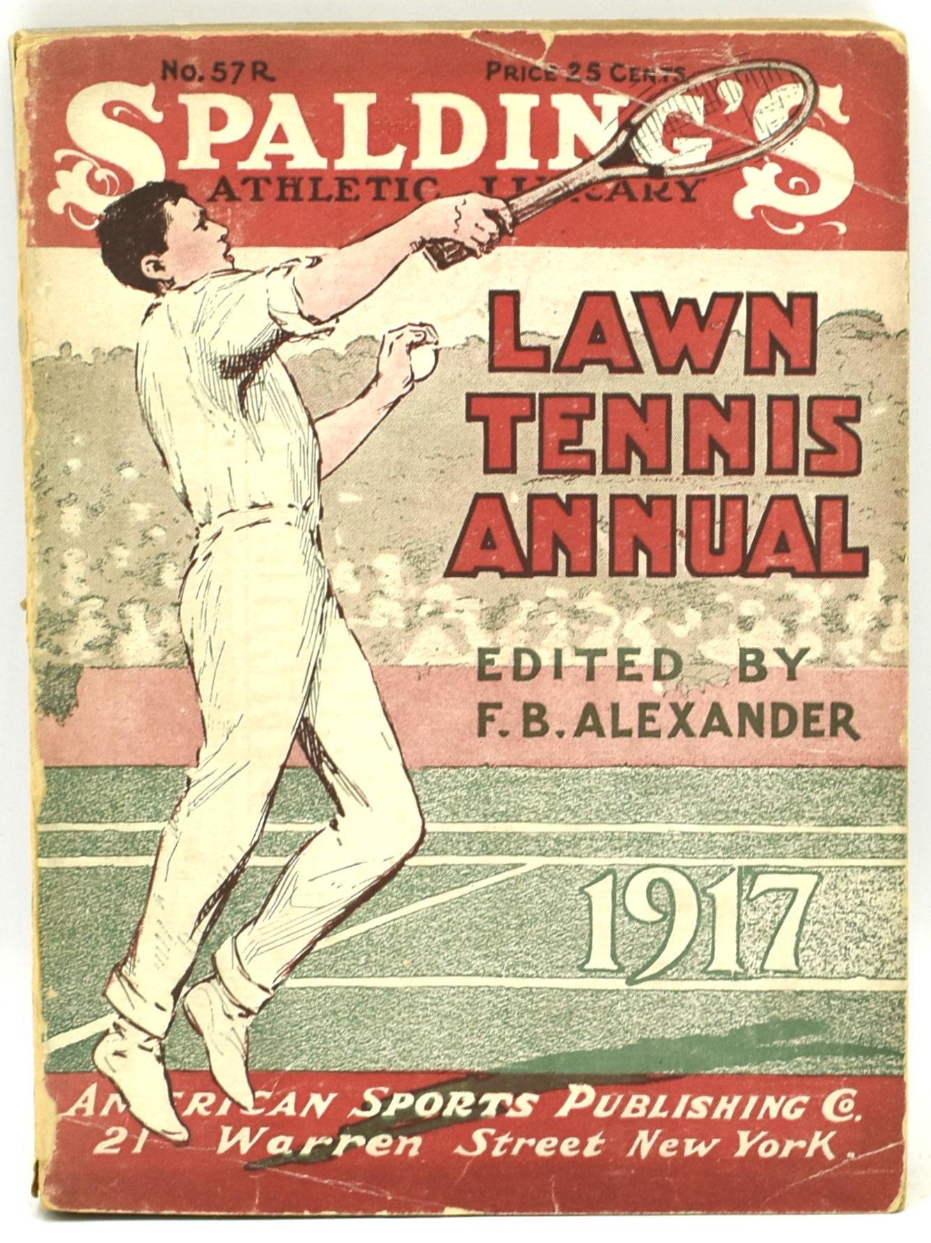 New York: American Sports Publishing Company, 1917. Original Wrappers. Very Good binding. 16mo.; in the publisher's red, green and white printed wrappers (it was part of Spalding's "Red Cover" Series of Athletic Handbooks); 333 pages, followed by 13 pages of ads; the wrappers are intact, and in nice condition; illustrated with a half-tone of CR. D. Wrenn, President of the US National Lawn Tennis Association; Richard Norris Williams was the national champion that year. Very Good binding.