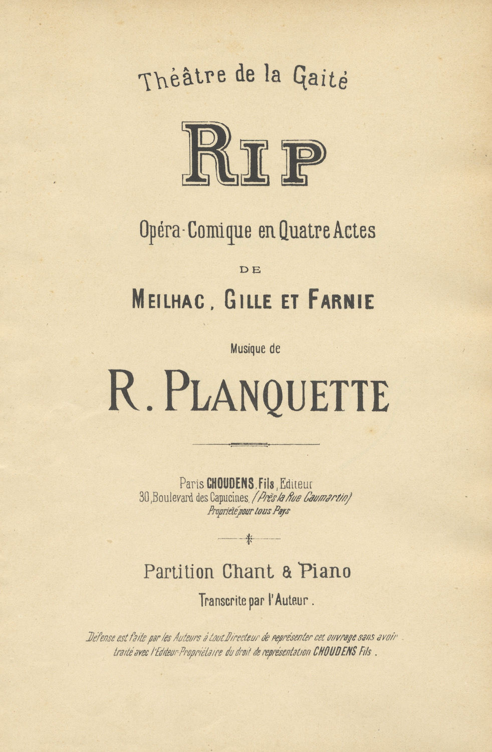 Rip Opéra-Comique en Quatre Actes de Meilhac, Gille et Farnie ... Partition Chant & Piano Transcrite par l'Auteur ... Théâtre de la Gaité. [Piano-vocal score]