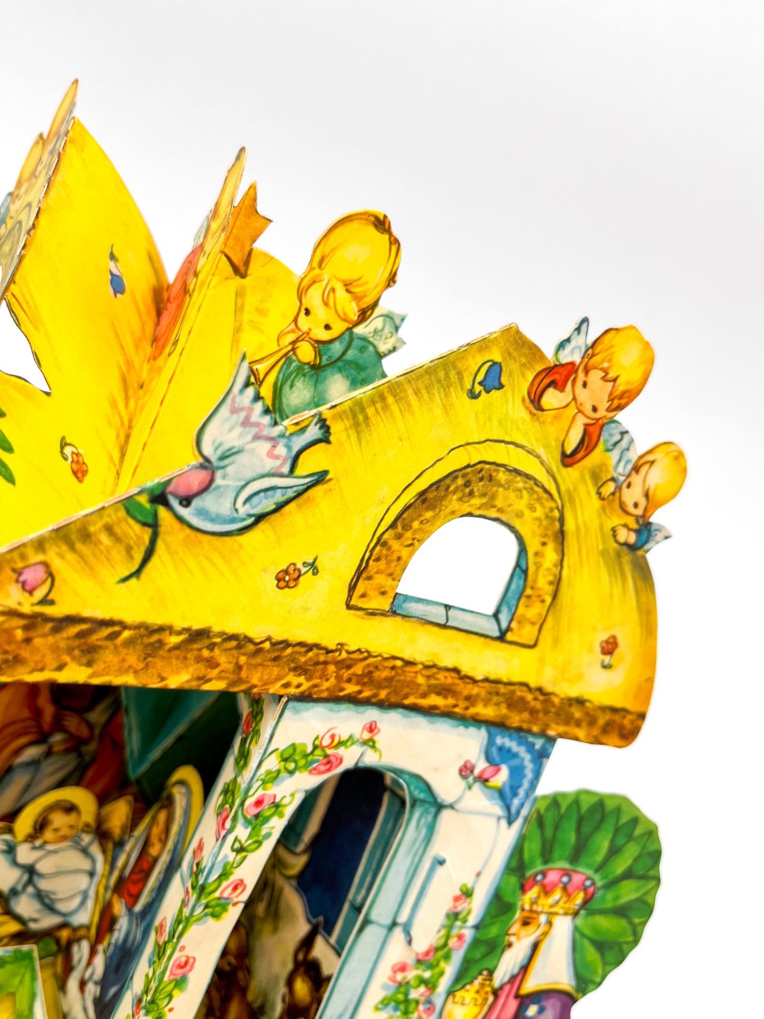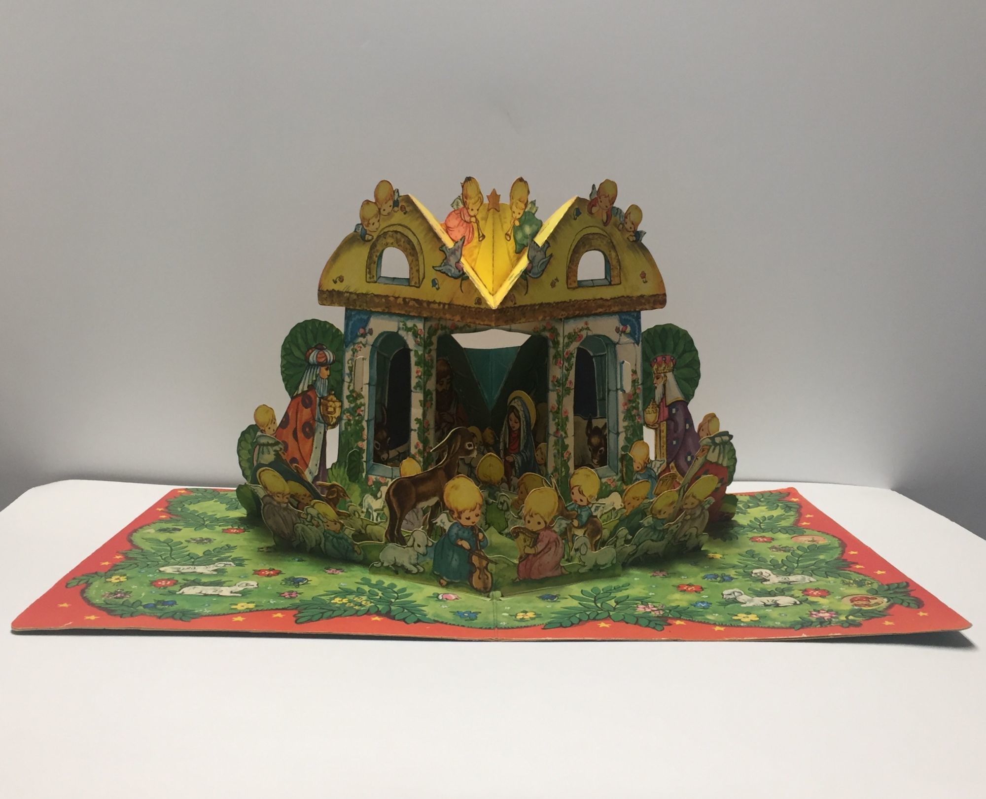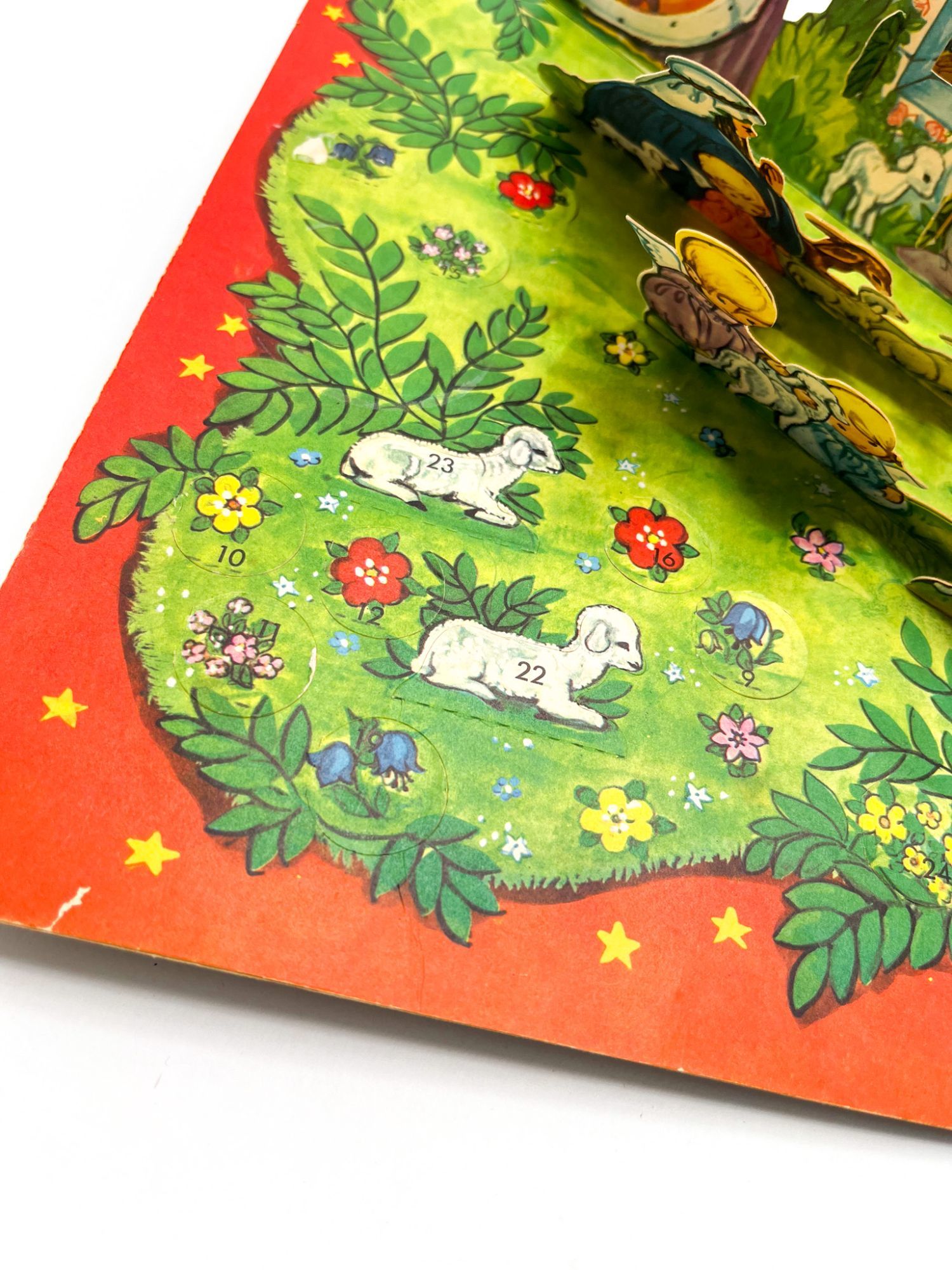 Sweden: E. O. & Co, 1960. Very Good plus.. First edition of this charming pop-up Advent calendar, featuring the Nativity and liftable flaps that reveal winter scenes and toys. The usual Nativity cast, including Mary, Joseph, the Wise Men, and the shepherds, is present in this attractive pop-up, along with a particularly large collection of cherubs. 13.25'' x 9.75''. Original color pictorial stiff card covers. Single opening, featuring color pop-ups and liftable flaps in the form of flowers and lambs. Covers with some edgewear and scuffing, spine tail bumped. Two flower flaps lacking, one with tiny tape repair. Pop-up sound and bright.