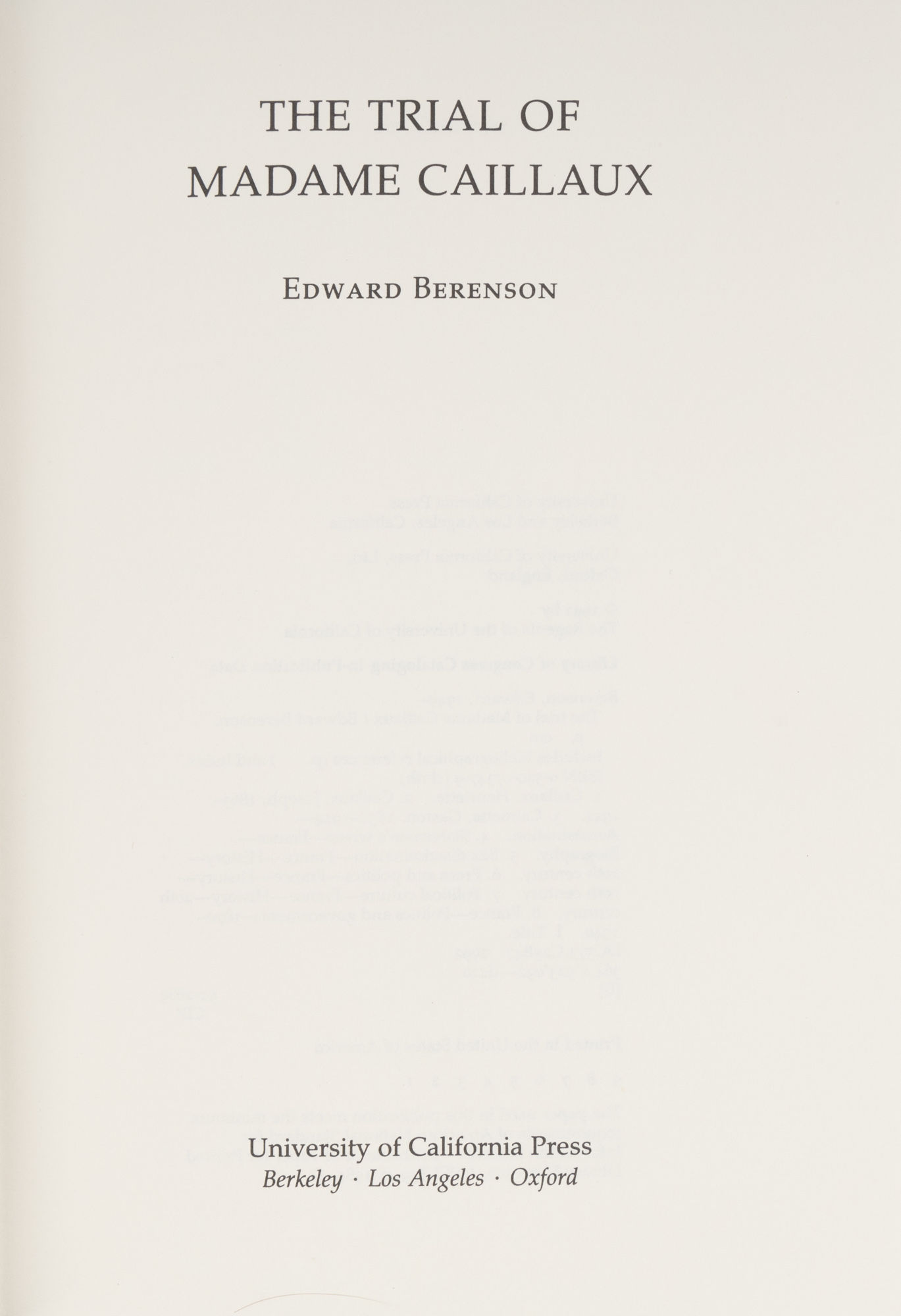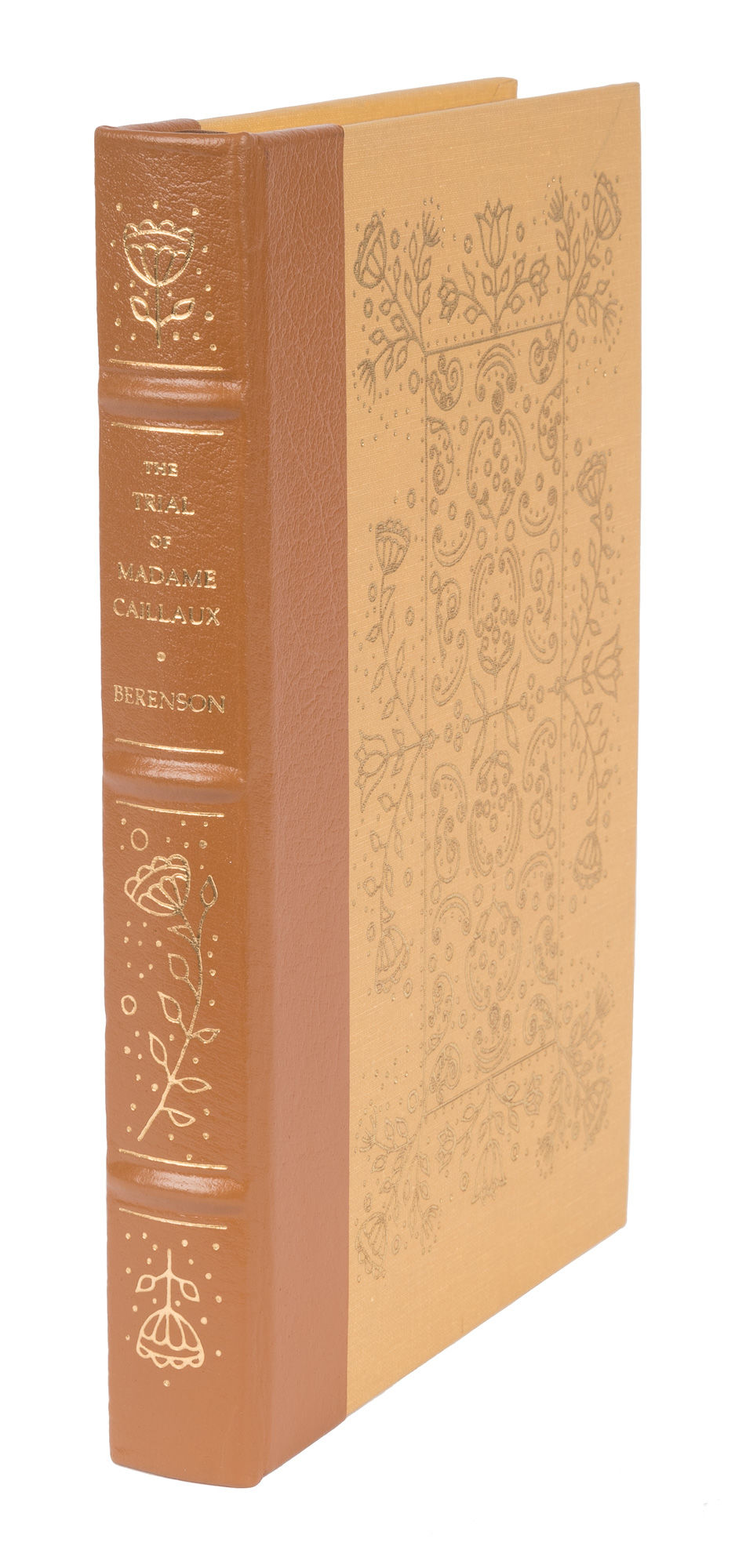 1992. Berenson, Edward. The Trial of Madame Caillaux. Berkeley: University of California Press, [1992]. [New York]: [Notable Trials Library], 1995. With New Introduction by Alan M. Dershowitz. xii, 296 pp. Quarter calf over cloth, decorative gilt stamping, raised bands, all edges gilt, marbled endpapers, ribbon marker. Fine. $25.
