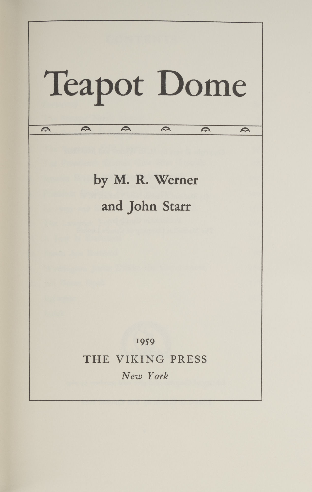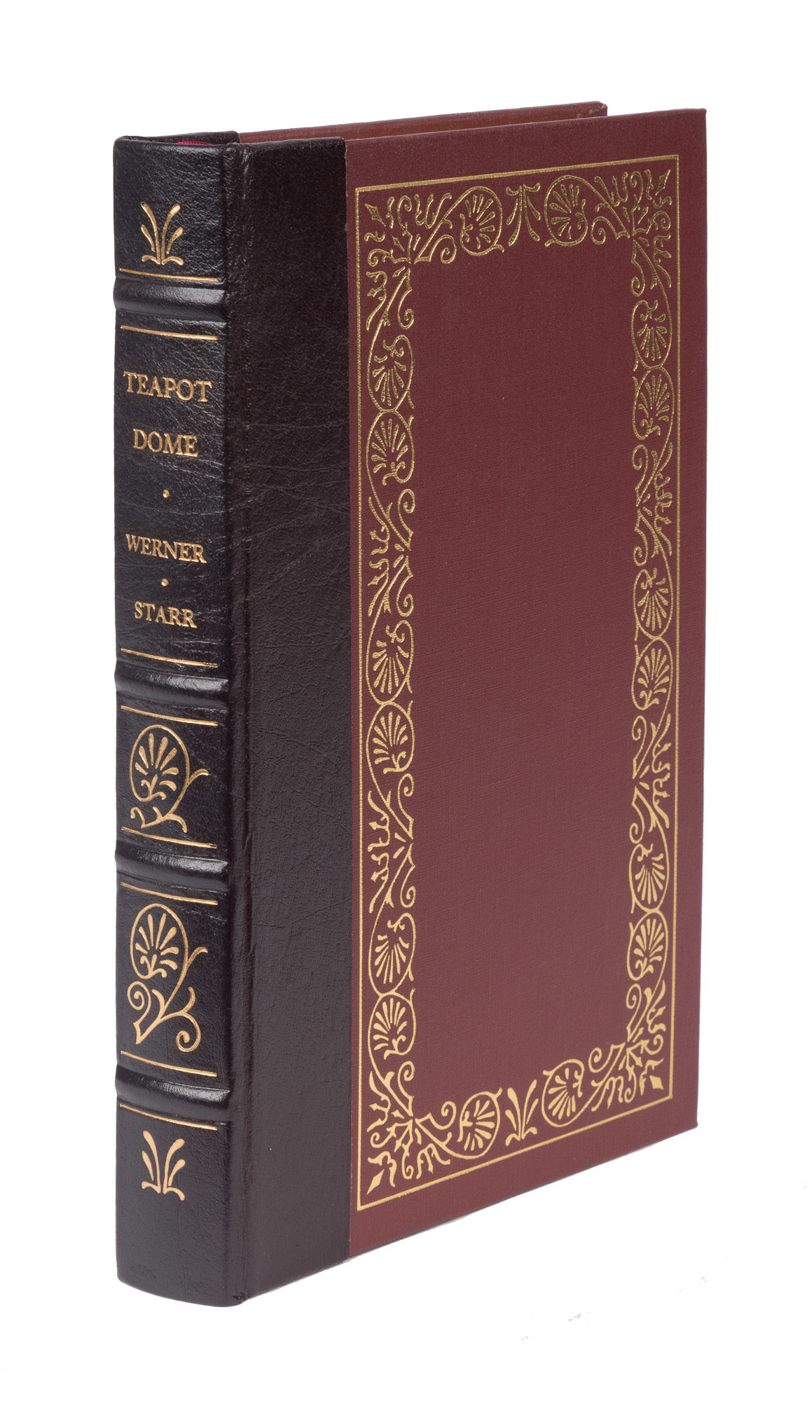 1993. Werner, M.R. and John Starr. Teapot Dome. The Viking Press, 1959. Reprint New York, N.Y.: Notable Trials Library, 1993. Introduction by Alan M. Dershowitz. x, 306 pp. Quarter calf over cloth, decorative gilt stamping, raised bands, all edges gilt, marbled endpapers, ribbon marker. Fine. $25.