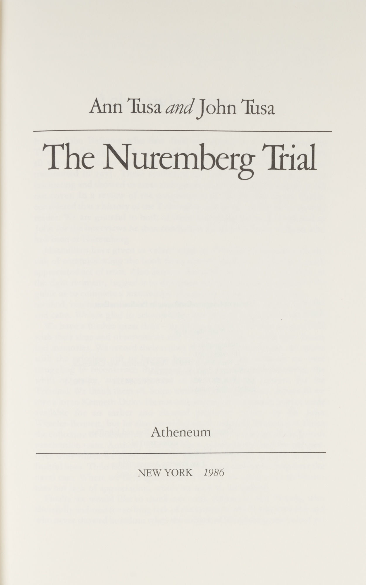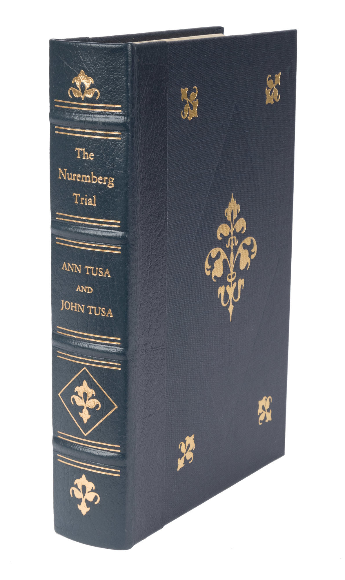 1990. Tusa, Ann, and John Tusa. The Nuremberg Trial. New York: Atheneum, 1986. Reprint. [Birmingham: The Notable Trials Library, 1990]. Introduction by Alan M. Dershowitz. [vi], 519, [2] pp. Quarter calf over cloth, decorative gilt stamping, raised bands, all edges gilt, marbled endpapers, ribbon marker. Fine. $25.