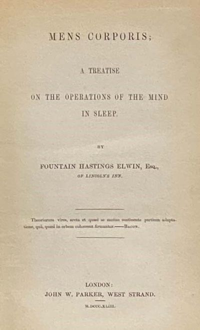 London: John W. Parker, 1843. Hard Cover. Very Good/No Jacket. Rebacked with original spine label laid down. Board corners rubbed. 1843 Hard Cover. 252, 4 pp. Includes: Introduction; The Nature of the Mind, and the Sensative and Insensative States; The Mental Action in the Sensative State; The Mental Operations in the Insensative State; The Period of Transition; The Operations of Mind in the Insensative State, continued; The Construction of the Mind; The Moral Power and Freewill; Various Opinions Concerning the Nature of the Mind and Instinct; Recapitulation and Conclusion; Notes.