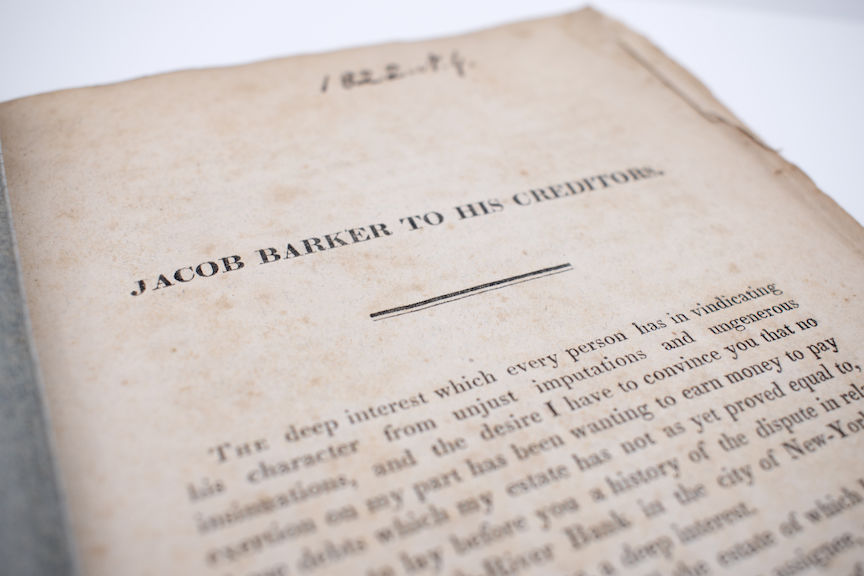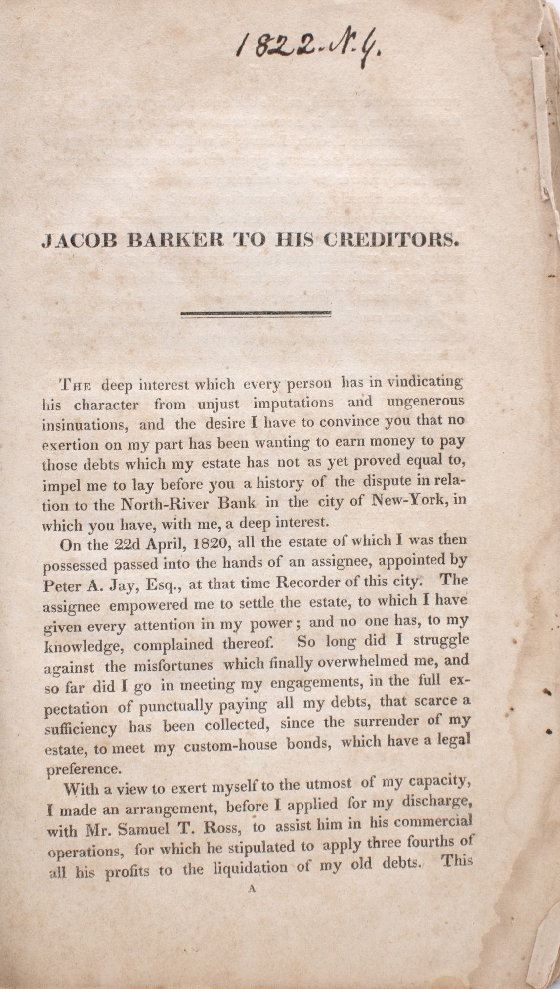 [New York]: [Privately-printed], 1822. iii, 98pp. [With:] An inscription on a small slip of paper signed by Barker presenting the book to Peter C. Baker, laid in. 8vo. Contemporary blue paper wrappers. iii, 98pp. [With:] An inscription on a small slip of paper signed by Barker presenting the book to Peter C. Baker, laid in. 8vo. Relates to the controversy concerning control of the North-River Bank between the early American financier, banker and stock trader Jacob Barker and the Director of the Bank David Rogers, with Barker being convicted in court of challenging Rogers to a duel after Rogers had slandered him at the Coffee-House. The pamphlet was privately-published by Barker in an attempt to clear his name and save the value of the bank stock for his creditors.