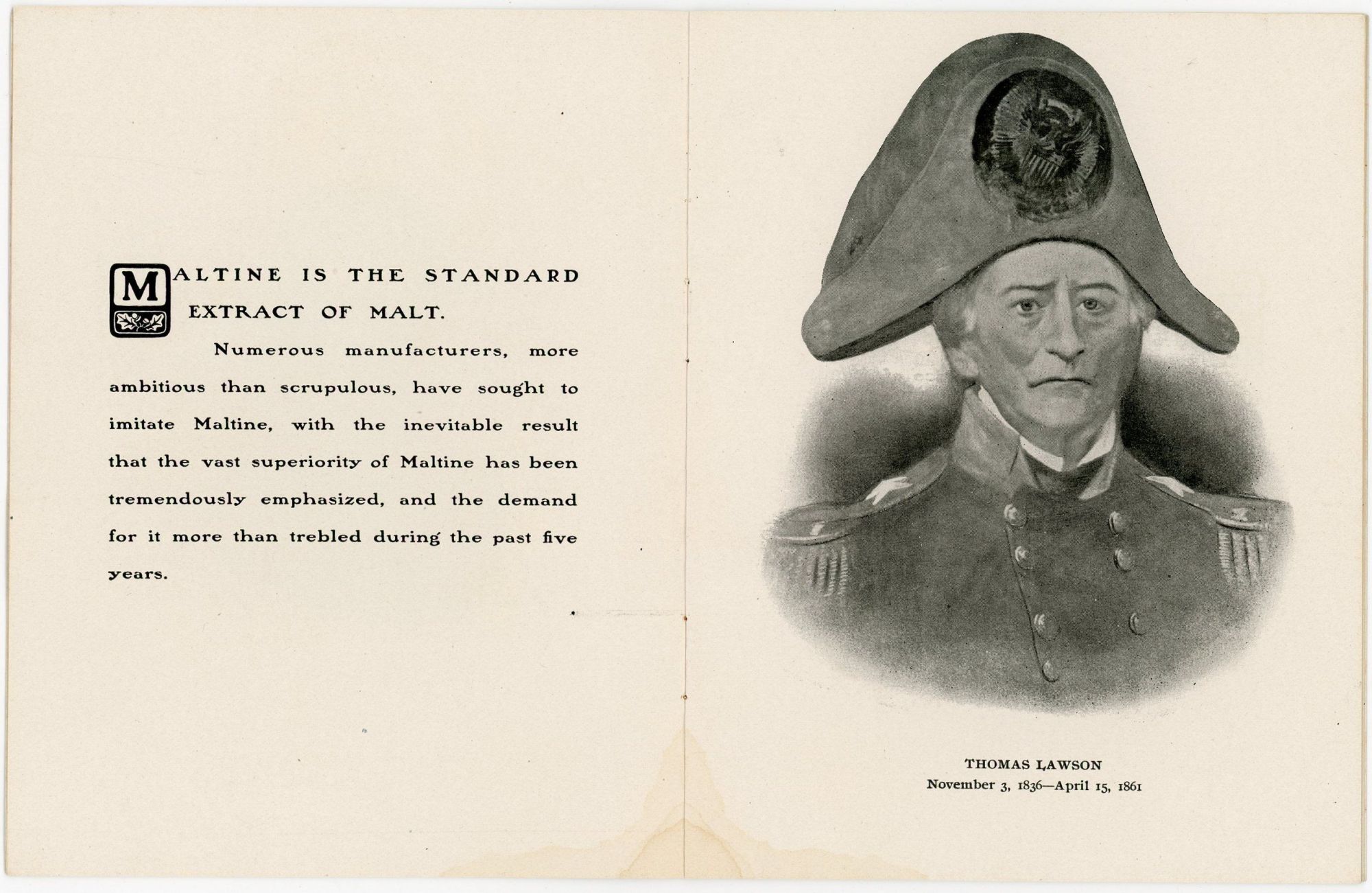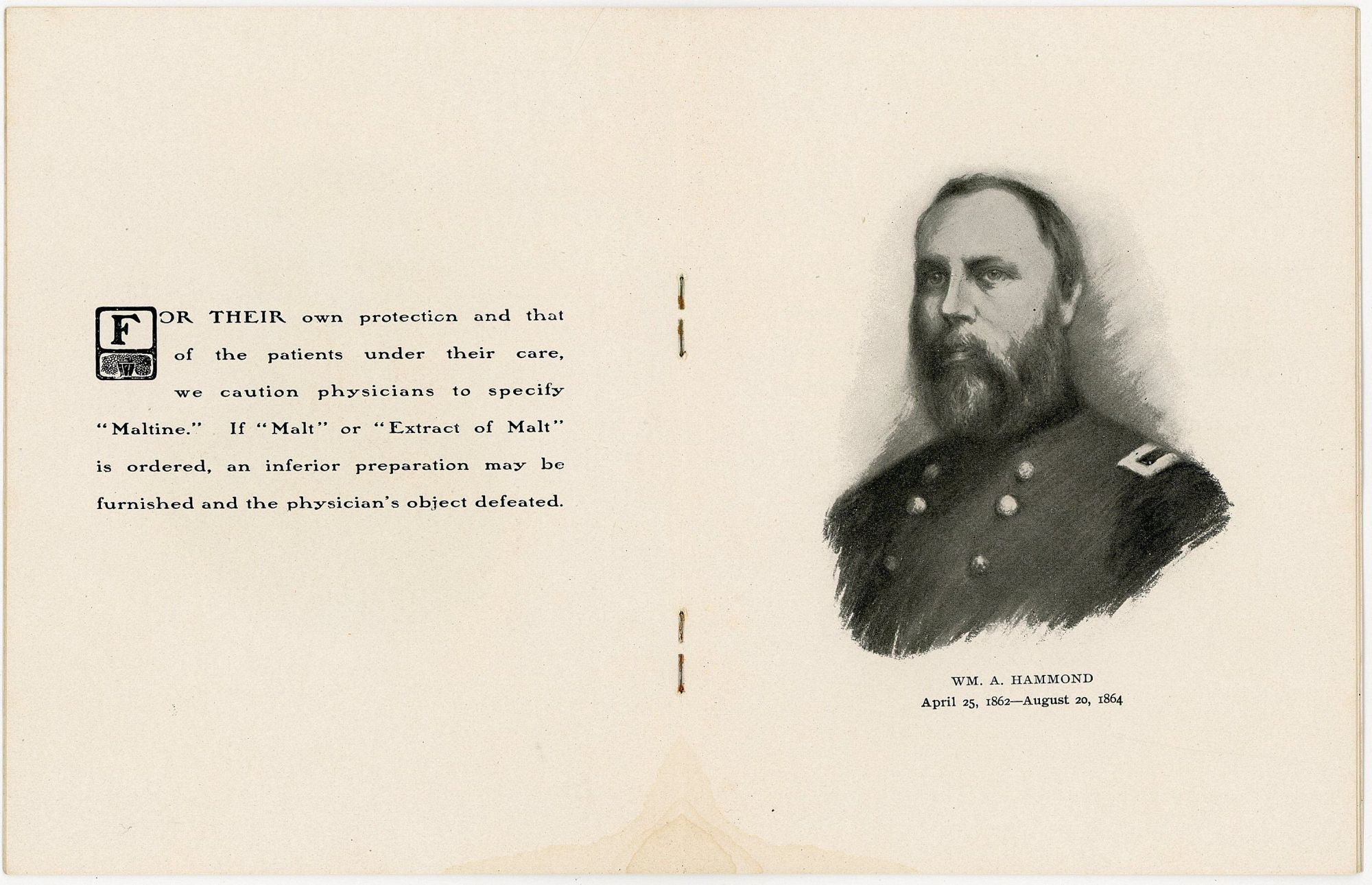 Brooklyn NY: Maltine Company, 1882. A 6" x 4 1/2" 16pp booklet with illustrated wraps. The cover depicts an American shield with crossed American and Red Cross flags. It is titled US Surgeons General United Sates Army. Series 1. It includes six (6) portraits of the surgeons general from 1815-1882. The portraits were copied by special permission form the original oil paintings in the possession of the Government. Each portrait is captioned with the name and dates of service. The narrative is promoting Maltine "extract of malt" , "Matine with Creosote and "Maltine with Wine of Pepsin". The booklet is speaking to physicians on the superiority of their product but may have been for the general public.