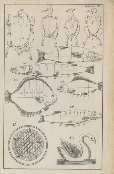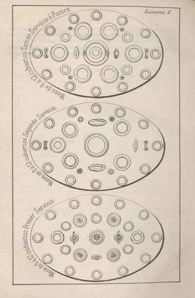 México, D.F.: Imprenta de Juan Nepomuceno del Valle, Puente de San Pedro y San Pablo núm. 8, 1866. (spine gilt lettered and decorated; spine and boards rubbed, corners bumped; title page with crudely repaired tear; pp 469-474 with small tear in upper margin not affecting text; o/w clean except for a few minor food stains, tight). contemporary brown embossed Mexican sheep, spine gilt lettered and decorated. First edition. Not in standard sources, but mentioned in Janet Long, Conquista y Comida: Consequencias del encuentro de dos mundos (Mexico: UNAM, 2003, p. 473). This anonymously written dictionary-cookbook is divided into four sections: recipes; setting the table (illustrated by some of the lithographs); a gastronomical calendar indicating which vegetables and spices are in season; and the art of carving at the table (also illustrated by some of the lithographs). As the title indicates, many of the recipes are of foreign origin (e.g. “Peras á la alemana” and “Peras de Inglaterra confitadas”), although many of the ones given are native Mexican dishes using traditional ingredients. In some instances, the recipes for particular animals are extensive. For example, one finds eighteen different recipes, including a large sample of foreign dishes, for partridges. Drink and cake recipes are also extensive, including some borrowed from foreign cultures. Included, for example, is “Ponche inglés,” about which it is observed: “Esta bebida inglesa se ha propagado ya demasiado entre nosotros. Se la reputa capaz de restaurar las fuerzas del individuo, y se mira como un escelente dijestivo, pero su abuso es peligroso” (p. 388). (The modern reader will recognize this drink as rum punch, here made with lemonade.) That recipe is supplemented by several more for native pulque and for a concoction called “Punche de muertos” (p. 395). Getting the food prepared is only half the battle, however, since it must eventually be served. The two sections on dining are replete with social customs and fashions, some of which were apparently problematic, especially for large gatherings. The first piece of advice, for example, is to clean thoroughly and be prepared well ahead of time so that problems can be corrected. The author may well have suffered a few unpleasant meals, for warnings are given against trying to seat people too close together and against using the wrong kind of lighting. (The author prefers those suspended from the ceiling rather than those that sit on the table, which cast shadows and can be knocked over.) The author also apparently underwent rude servants at some point, because their appearance and behavior are specifically commented upon. Finally, the author also seems to have witnessed problematical carving, because obvious pitfalls are warned against: the knives must be of various but correct sizes, must be sharp, and the carving preferably takes place at a side table by someone with the proper knowledge and skills (“Sus manos deben ser ájiles y bien aseguradas, sus brazos flexibles y rollizos…”). All the plates serve to illustrate various table settings and the carving process for various cuts of meat (sides of beef, pork, various fowl, and fish). OCLC shows two copies (UCSD, UTSA).