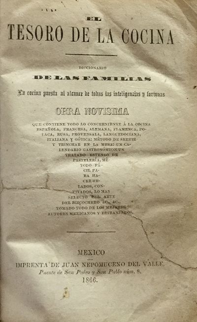 EL TESORO DE LA COCINA DICCIONARIO DE LAS FAMILIAS. LA COCINA PUESTA AL ALCANCE DE TODAS LAS INTELIGENTES Y FORTUNAS OBRA NOVISIMA QUE CONTIENE TODO LO CONCERNIENTE Á LA COCINA ESPAÑOLA, FRANCESA, ALEMANA, FLAMENCA, POLACA, RUSA, PROVENSALA, LANGUEDOCIANA, ITALIANA Y GÓTICA; MÉTODO DE SERVIR Y TRINCHAR EN LA MESA: UN CALENDARIO GASTRONÓMICO: UN TRATADO ESTENSO DE PASTELERÍA, MÉTODO FÁCIL PARA HACER HELADOS, CONFITADOS, LO MAS SELECTO DEL ARTE DE BIZCOCHERO, &C., &C., TOMADO TODO DE LOS MEJORES AUTORES MEXICANOS Y ESTRANJEROS