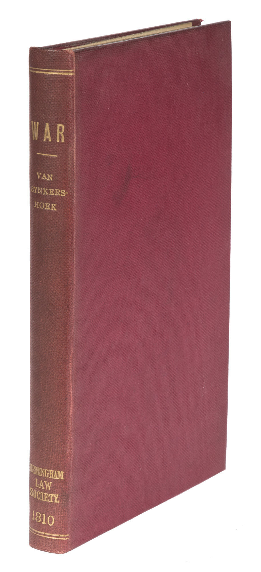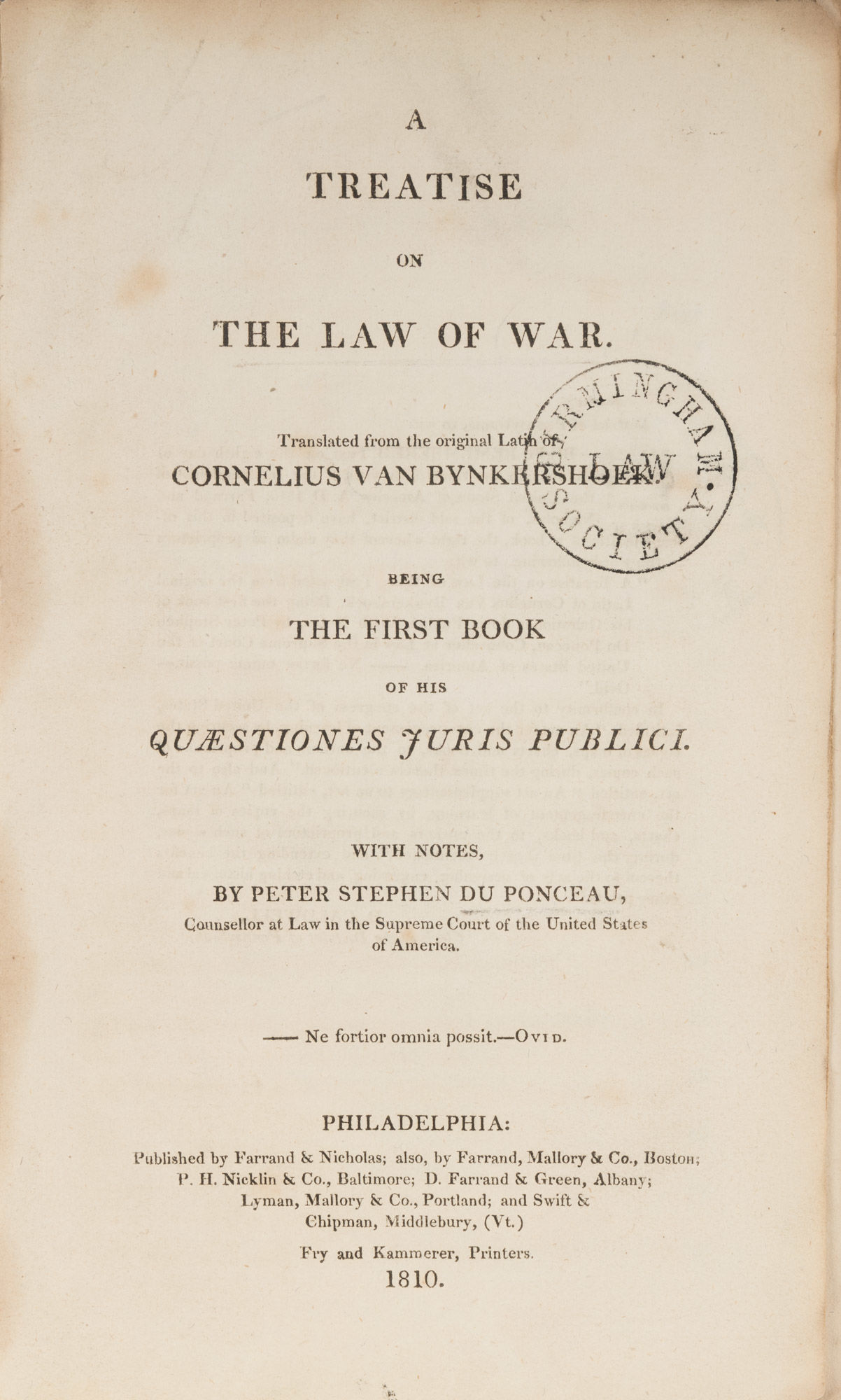 1810. Philadelphia, 1810. Only edition. Philadelphia, 1810. Only edition. Du Ponceau's Translation of De Rebus Bellicus Bynkershoek, Cornelius van [1673-1743]. Du Ponceau, Peter S. [1760-1844], Editor and Translator. A Treatise on the Law of War: Being the First Book of His Quaestiones Juris Publici. Translated From the Original Latin with Notes, by Peter Stephen du Ponceau. Philadelphia: Published by Farrand & Nicholas [et al.], 1810. xxxiv, 218 pp. Octavo (8-1/2" x 5-1/2"). Later library cloth, gilt title, date and library name to spine. Negligible light shelfwear, library bookplate and shelf to front pastedown, library stamp to title page and a few other leaves at beginning and end of text. Moderate toning to text, slightly heavier in places, browning and a few minor chips to upper margins of final ten leaves. $450. * Only edition, one of two issues (the other bound into copies of Volume III of the American Law Journal). A translation of De Rebus Bellicus, part one of Bynkershoek's Quaestiones Juris Publici (1737), A Treatise on the Law of War addresses the customs of land and sea warfare. A notably humane work, it condemns actions against civilians and advocates the fair treatment of prisoners of war. Du Ponceau's able translation is prefaced by a biography of the author, a table of cases, an index of citations from the Corpus Juris Civilis and an annotated bibliography of civil law treatises cited or referred to by the author. This latter item, which lists editions and translations, is interesting for its insights into the American reception of the civil law in the early 1800s. Du Ponceau is an important figure in the early history of American law and letters. He founded the Law Academy of Philadelphia in 1821, was the President of the American Philosophical Society and was a much-consulted expert on international relations and linguistics. Cohen, Bibliography of Early American Law 7166.
