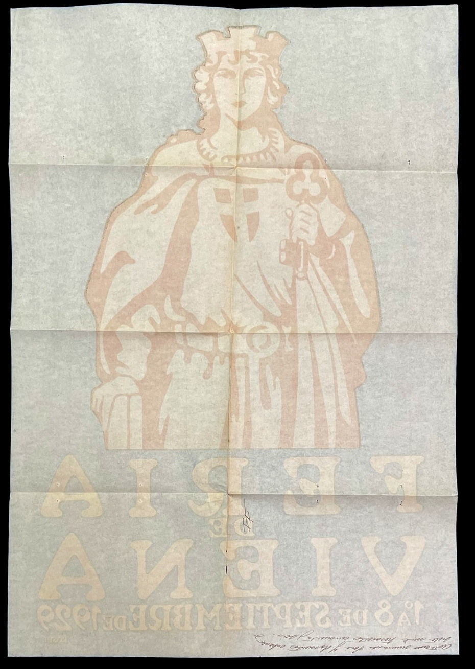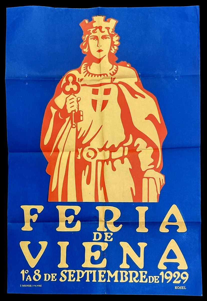 Vienna, Austria: J. Weiner, 1929. Folded. Few small separations on folds with minimal detraction. A 35" x 23 1/2" vividly colored poster for the Vienna Fair in 1929. A striking and bold allegorical depicting of what appears to be a powerful woman crusader wearing a crown and holding the key. Captioned Feria de Viena 1a8 de Septembre de 1929. Reverse is blank with inscription at base.