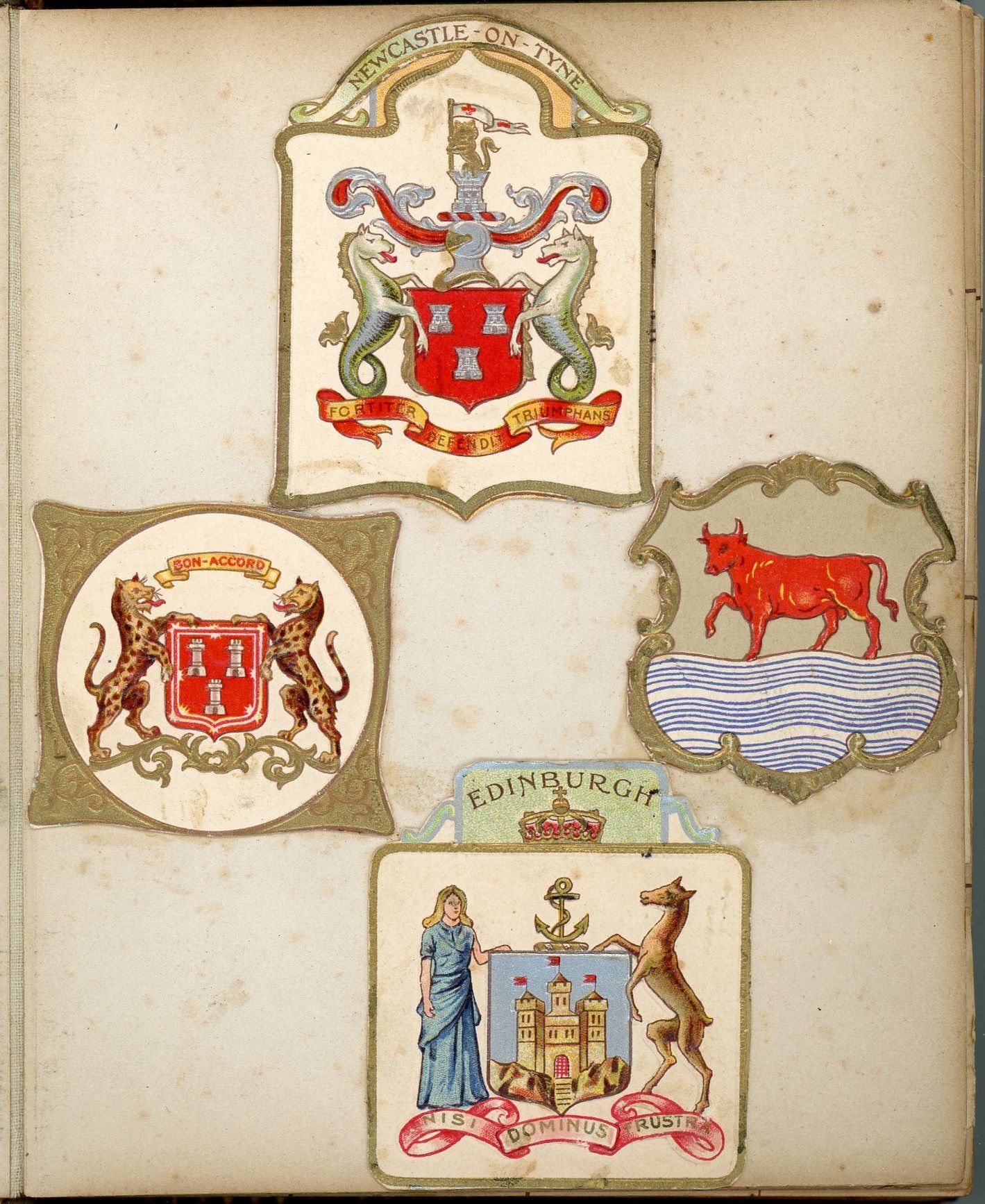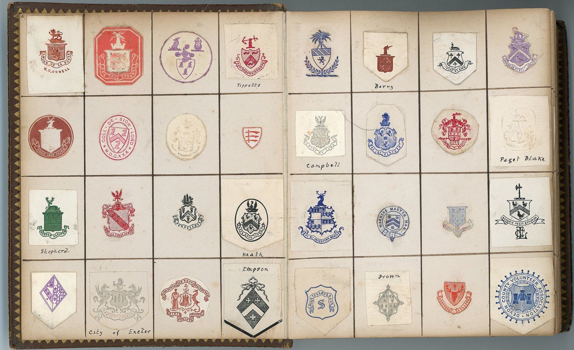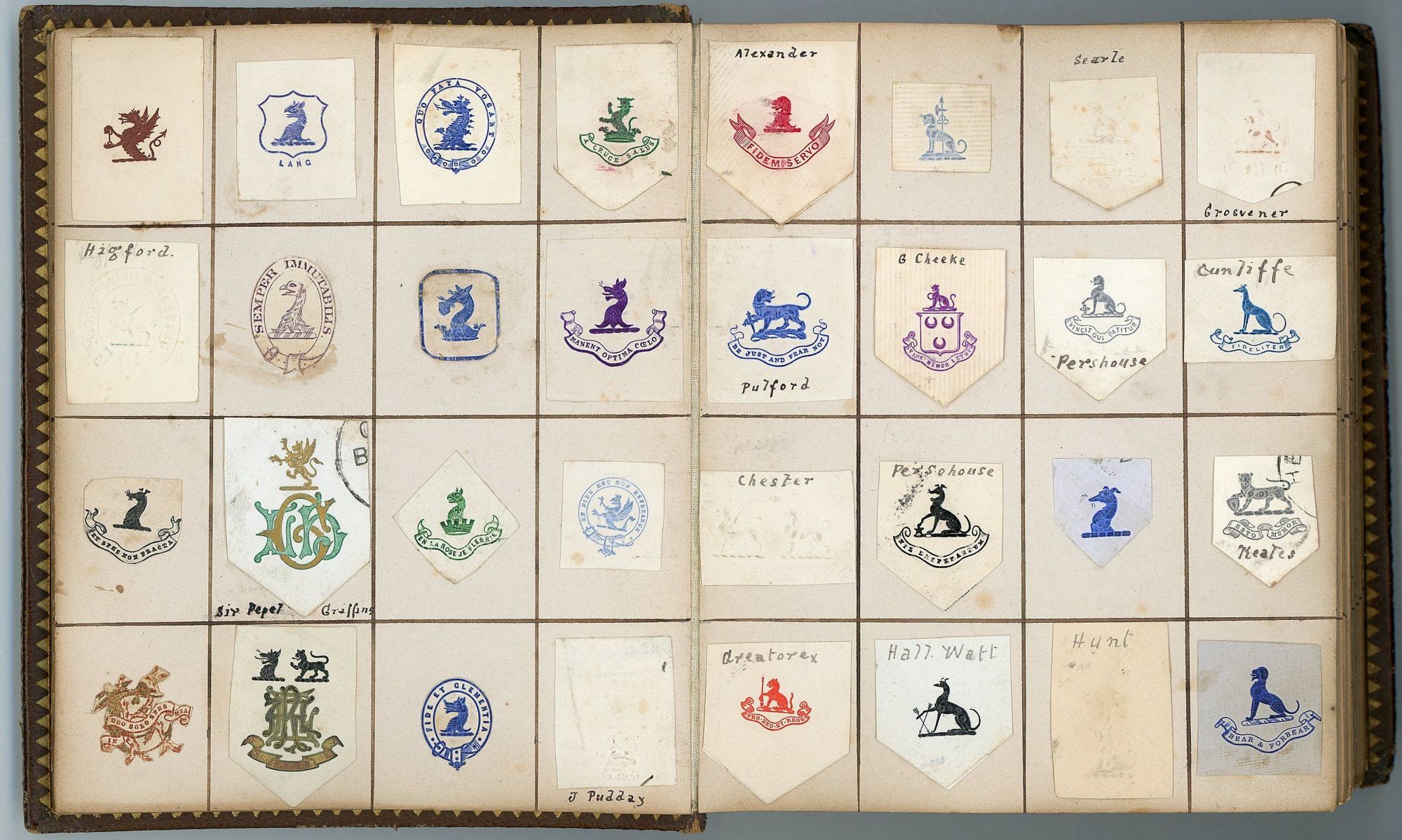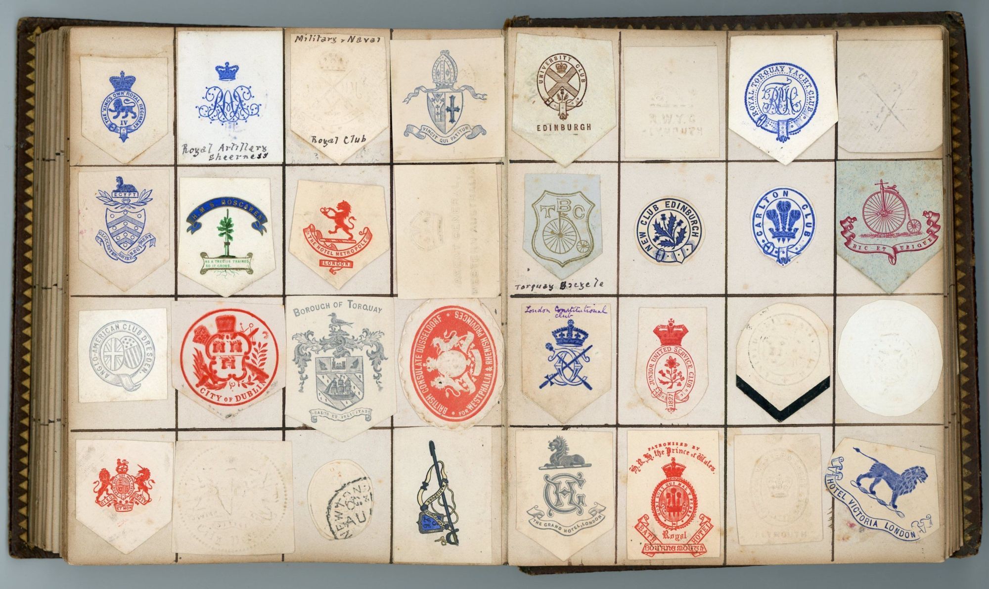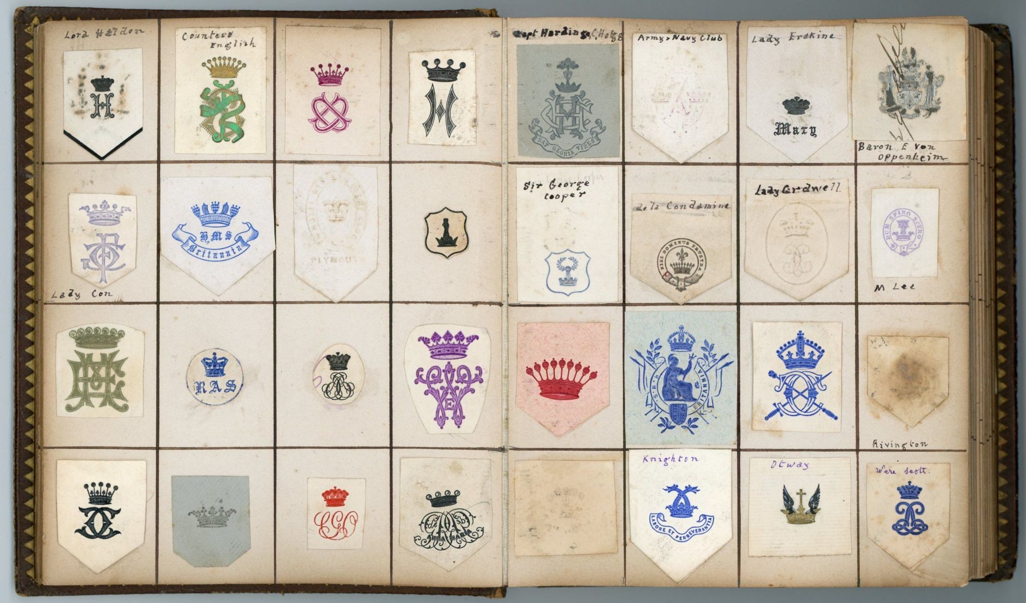 United Kingdom. Heavy cover wear.. 25 gilt edge light board leaves with over 600 monograms and crests encountered and preserved by one individual in his day to day life. Includes individuals, presumably acquaintances, municipalities, associations, institutions, etc. A surname has been penned adjacent several of the images. With the exception of the first page all monograms and crests approximately 1" x 1". No identification of the owner. Measures 6" x 5