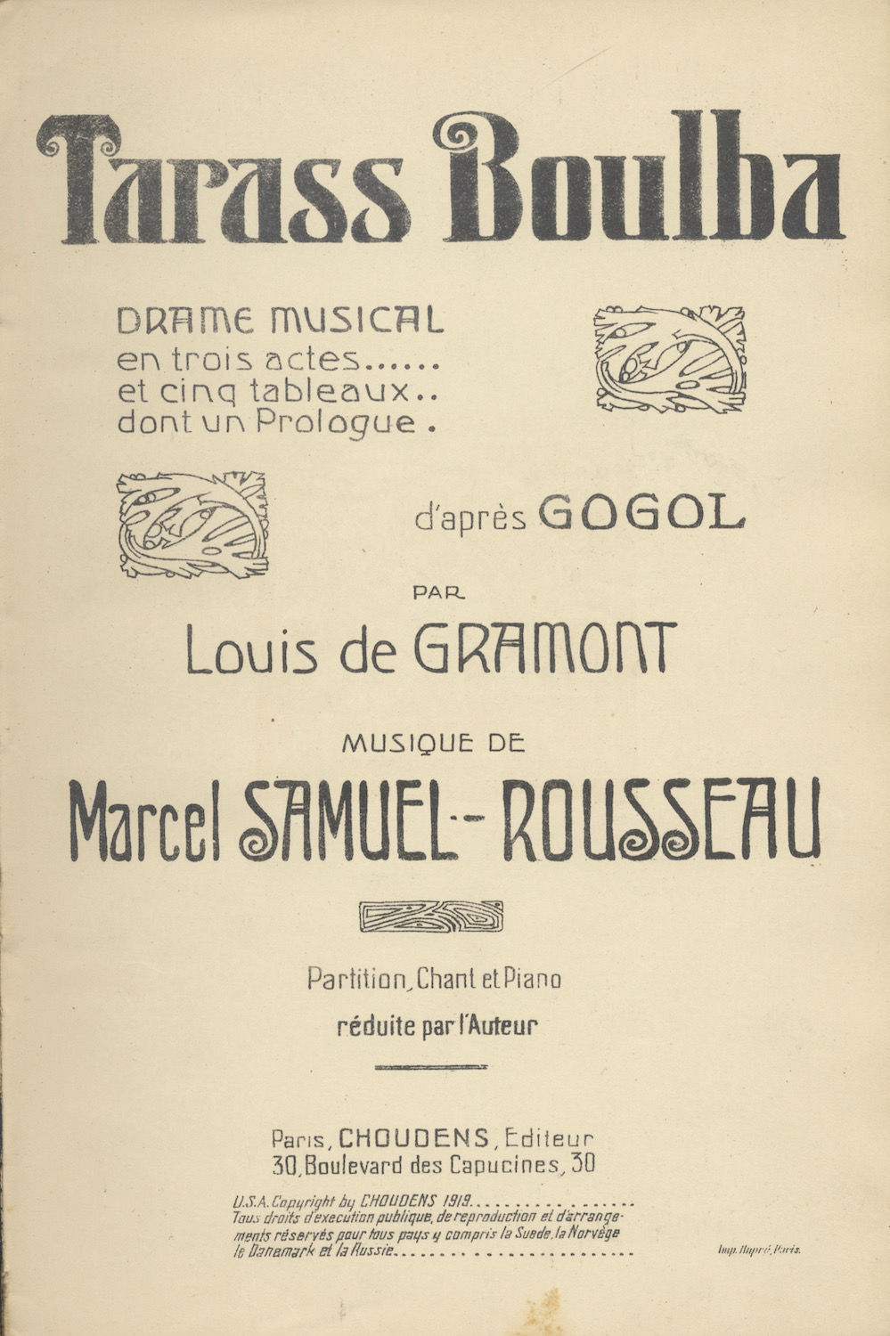 Tarass Boulba Drame Musical en trois actes ... et cinq tableaux ... dont un Prologue ... d'après Gogol par Louis de Gramont... Partition Chant et Piano réduite par l'Auteur. [Piano-vocal score]