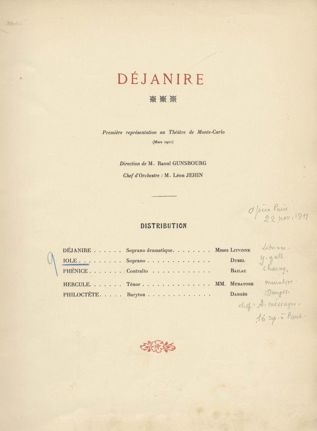 Manuscript notes in pencil recording the cast of the performance at the Paris Opéra on 22 November 1911 under André Messager (the 16th performance of the work in Paris).
