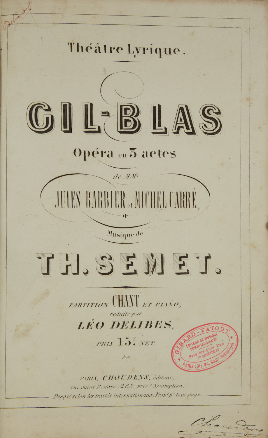 Gil-Blas Opéra en 3 actes de MM Jules Barbier et Michel Carré ... Partition Chant et Piano réduite par Léo Delibes, Prix: 15 f. net. [Piano-vocal score]