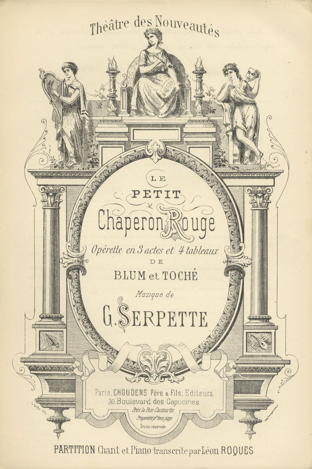 Le Petit Chaperon Rouge opérette en 3 actes et 4 tableaux de Blum et Toché ... Théâtre des Nouveautés ... Partition Chant et Piano transcrite par Léon Roques. [Piano-vocal score]