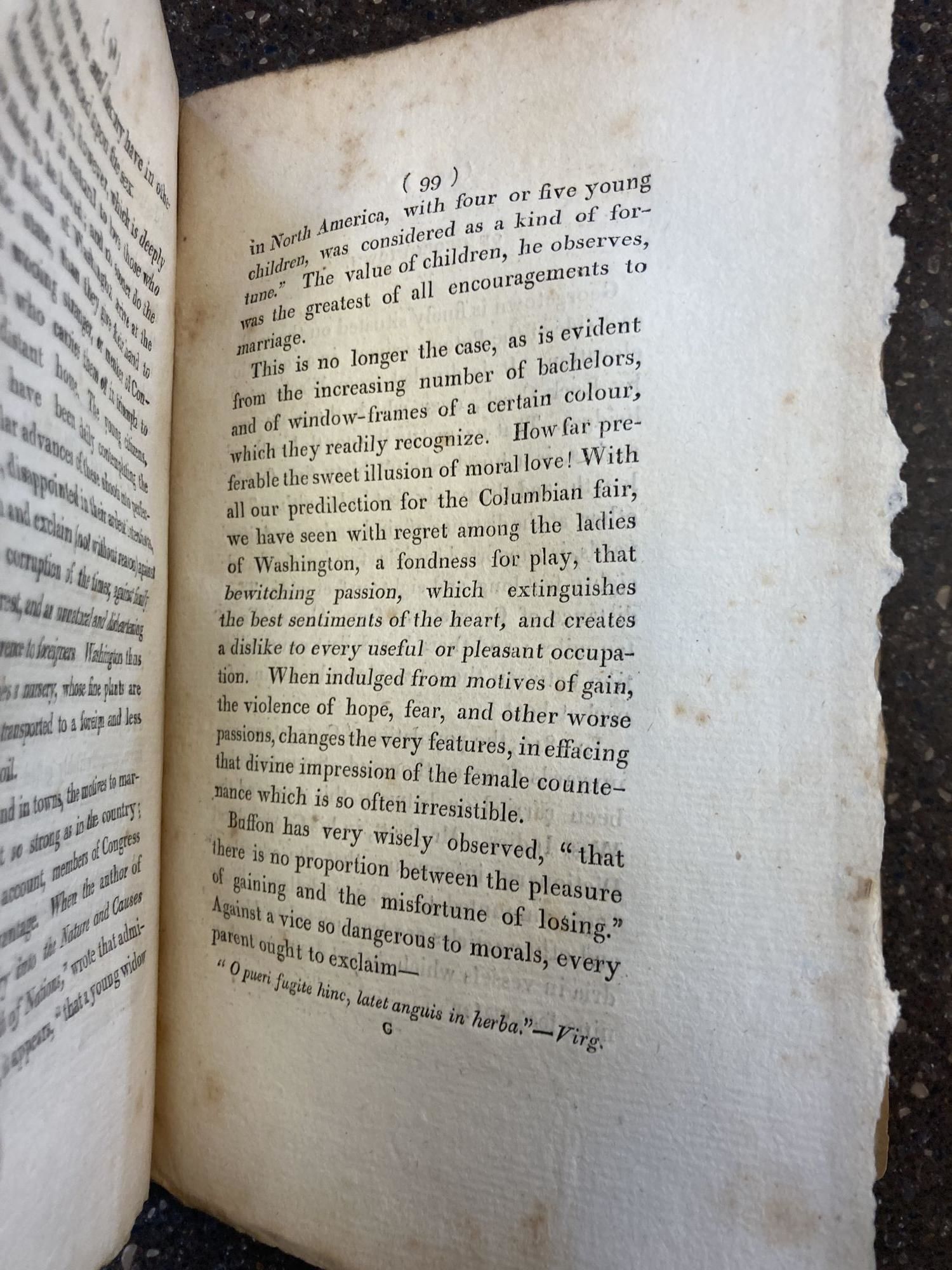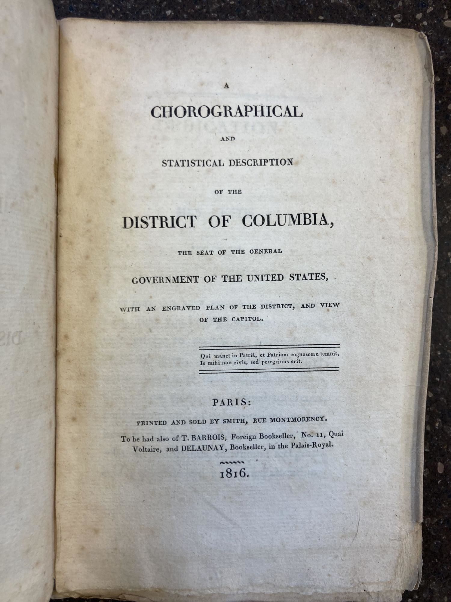 Paris: Printed and sold by Smith, Rue Montmorency, 1816. 12mo., vii, [1], 212, [2]; VG; bound in original blue/green paper wraps, paper on spine tattered; front cover detached but present; entire volume uncut and untrimmed; mild foxing throughout; with 2 folding tables, a folding plate of the Capitol, and a folding map of DC, as issued; shelved case 1. Sabin 101355;. 1344093. Shelved Dupont Bookstore.