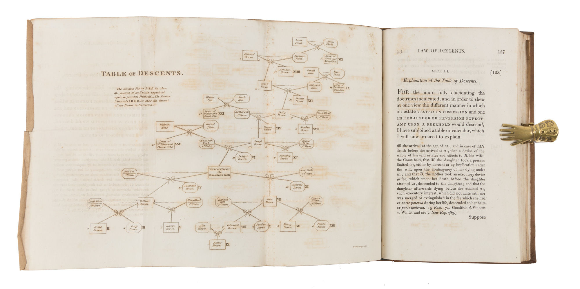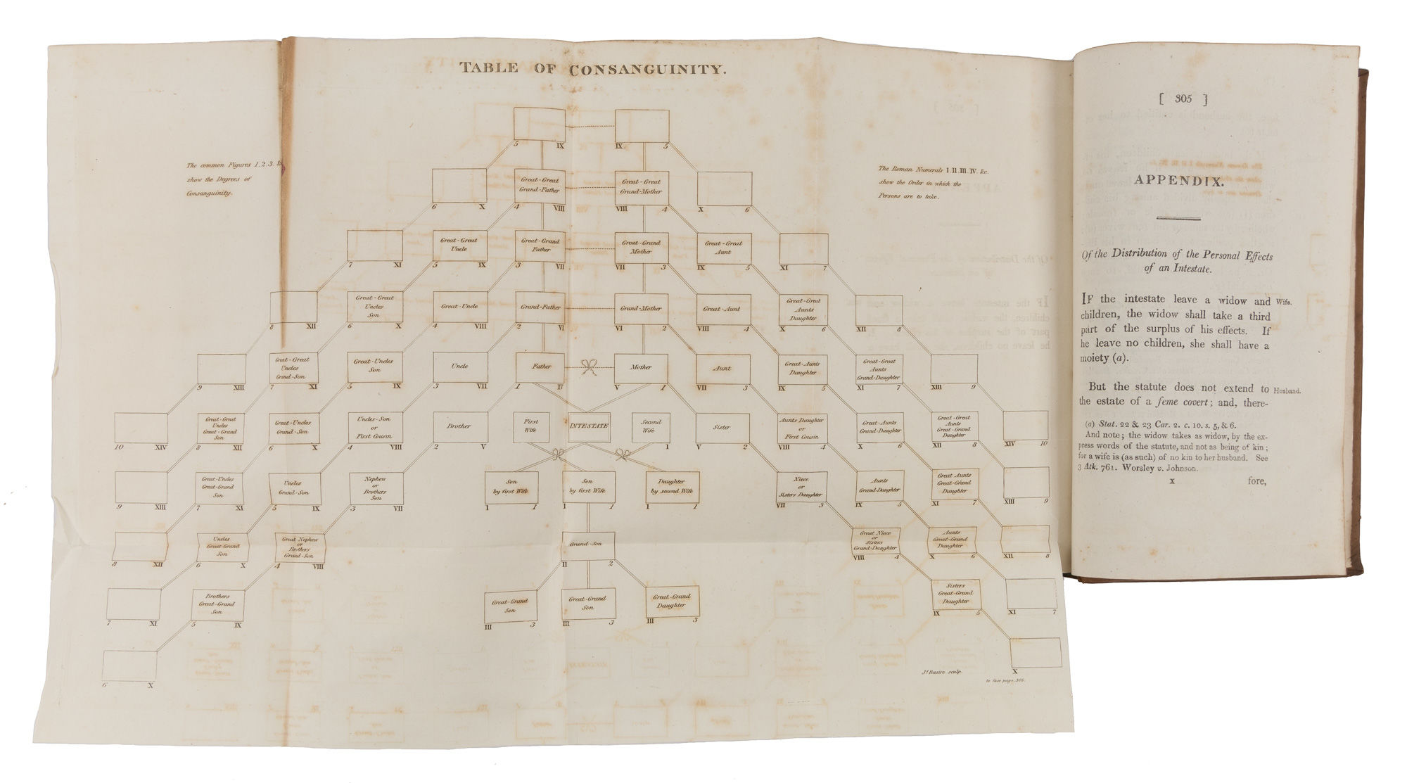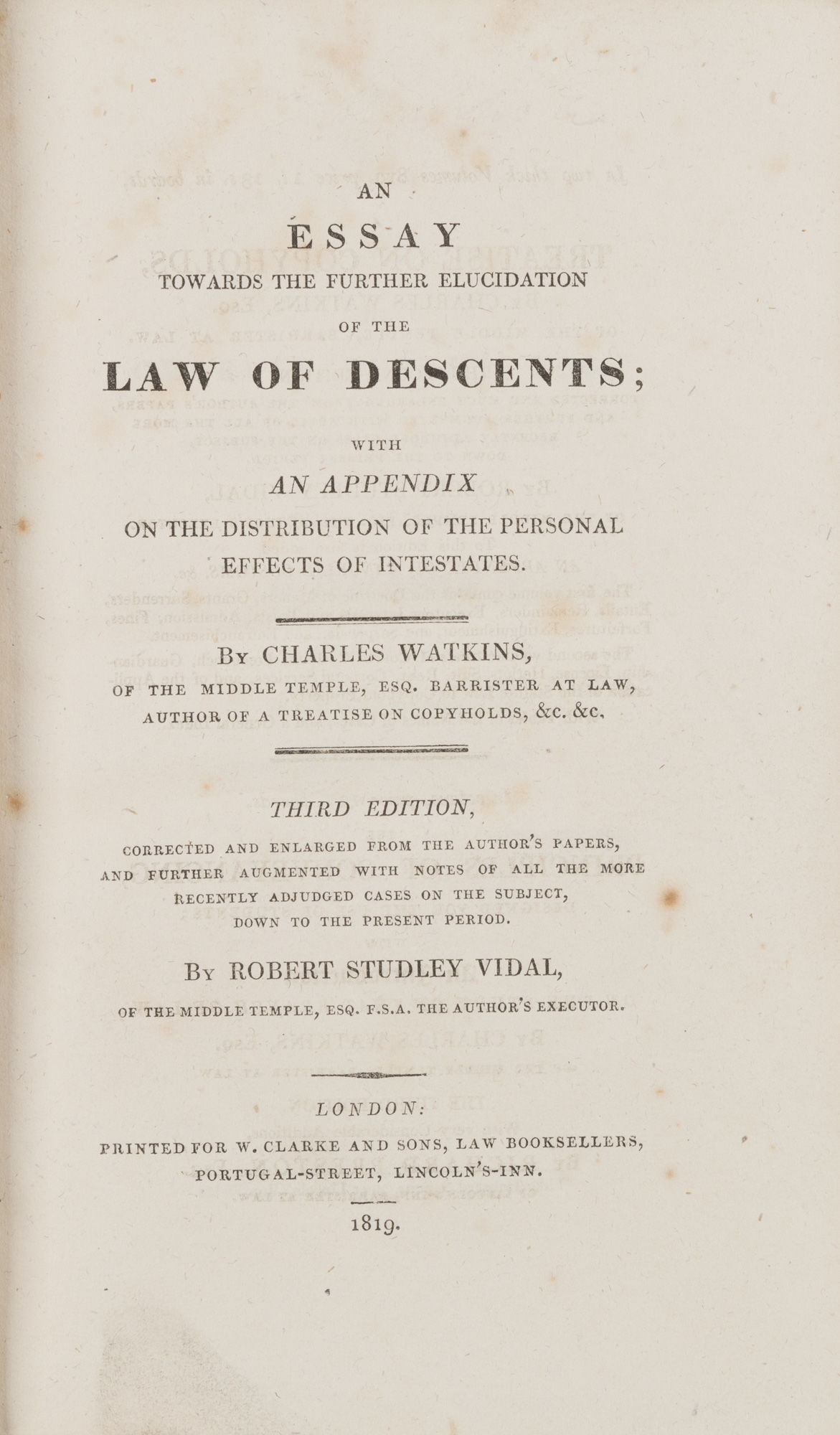 1819. A Very Valuable Treatise on that Very Intricate and Important Subject" Watkins, Charles [d.1808]. Vidal, Robert Studley, Editor. An Essay Towards the Further Elucidation of the Law of Descents; With an Appendix on the Distribution of the Personal Effects of Intestates. Corrected and Enlarged from the Author's Papers, And Further Augmented with Notes of All the More Recently Adjudged Cases on the Subject, Down to the Present Period. London: Printed for W. Clarke and Sons, 1819. [xvi], 331, [1], [4] pp. Includes 4-page published catalogue, publisher advertisment to verso of half-title. Two fold-out engraved copperplate tables (of descents and consanguinity). Octavo (8-1/2" x 5"). Contemporary calf, blind fillets to boards, lettering piece and blind fillets to spine. Minor nicks and scuffs to boards, moderate rubbing to extremities, light gatoring to spine, small chip to head of spine, joints starting at ends, corners bumped and lightly worn, early owner bookplate to front pastedown. Moderate toning to text, light foxing in places, light soiling to a few leaves, some creasing and edgewear to folding tables. $500. * Third edition. This is a useful supplement to Chapter 14, Volume II, of Blackstone's Commentaries, "Of Title by Descent". "Mr. Watkins' Essay on Descents is a very valuable treatise on that very intricate and important subject" (Marvin). First published in 1793, this treatise went through four editions, the final in 1837. Marvin, Legal Bibliography 721 (Citing Barton, Modern Precedents in Conveyancing). Sweet & Maxwell, A Legal Bibliography of the British Commonwealth 1:478 (35).