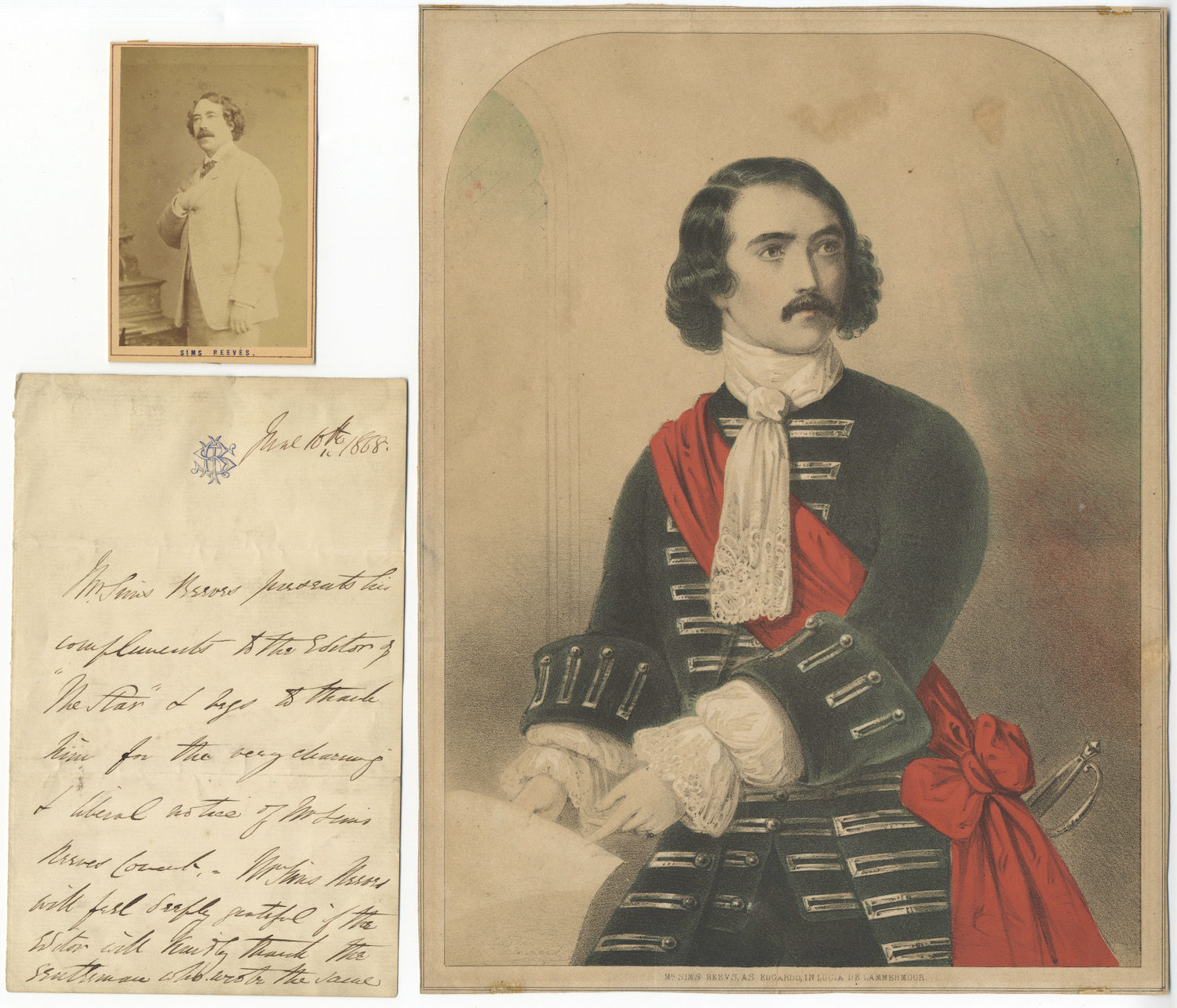 A three-quarter-length color lithograph by John Brandard of Reeves as Edgardo in Donizetti's opera Lucia di Lammermoor. Ca. 1847. Ca. 286 x 216 mm. Slightly worn, soiled, and browned; several small edge tears; imprint trimmed (but London). Reeves was particularly known for his performance of this role.