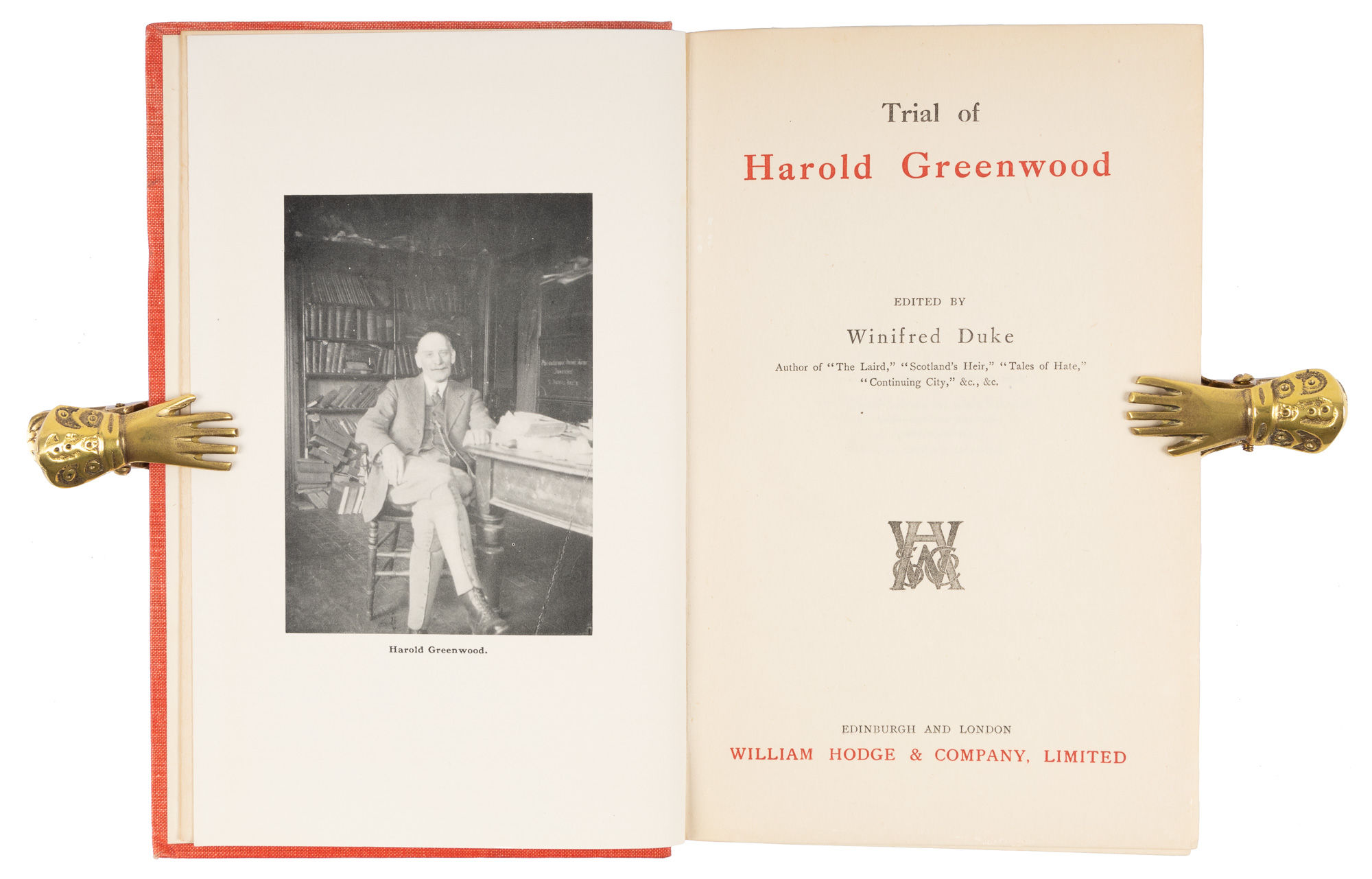 1930. [Trial]. Greenwood, Harold, Defendant. Duke, Winifred, Editor. Trial of Harold Greenwood. Edinburgh: William Hodge & Company, [1930]. xi, 347 pp. Frontispiece and nine additional illustrations with fold-out map. Hardcover. Original red cloth with gilt lettered spine. Ex-library with property stamps and shelf location label at foot of spine. Spine faded. Good. $25. * First edition. A title in the Notable British Trials series. In the early morning of June 16th, 1919, Mrs. Greenwood died suddenly after a few hours' illness. Her doctor granted a certificate to the effect that death was due to valvular disease of the heart, and she was buried in Kidwelly churchyard. Following village gossip aroused by Greenwood's second marriage, her body was exhumed, and an expert's examination revealed the presence of a small quantity of arsenic in the organs.